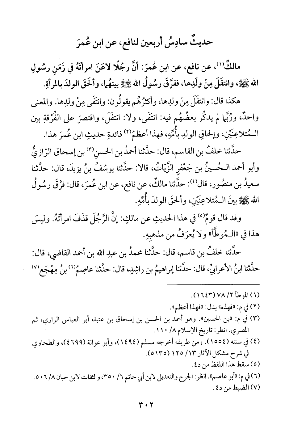 مالكٌ (¬١)، عن نافع، عن ابن عُمرَ: أنَّ رجُلًا لاعَنَ امرأتَهُ في زَمَنِ رسُولِ الله -صلى الله عليه وسلم-، وانتفَلَ مِنْ ولَدِها، ففرَّقَ رسُولُ الله -صلى الله عليه وسلم- بينهُما، وألحَقَ الولدَ بالمرأةِ.