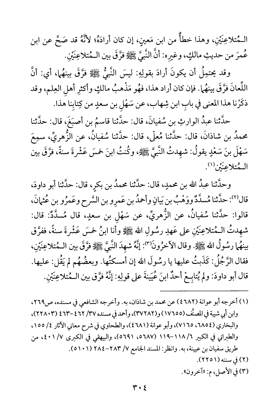 وحدَّثنا عبدُ الله بن محمدٍ، قال: حدَّثنا محمدُ بن بكرٍ، قال: حدَّثنا أبو داودَ، قال (¬٢): حدَّثنا مُسدَّدٌ ووَهْبُ بن بَيانٍ وأحمدُ بن عَمرِو بن السَّرح وعَمرُو بن عُثمانَ، قالوا: حدَّثنا سُفيانُ، عن الزُّهريِّ، عن سَهْلِ بن سعدٍ، قال مُسدَّدٌ: قال: شهِدتُ المُتلاعِنَيْنِ على عَهدِ رسولِ الله -صلى الله عليه وسلم- وأنا ابنُ خمسَ عَشْرةَ سنةً، ففرَّق بينهُما رسُولُ الله -صلى الله عليه وسلم-. وقال الآخرُونَ (¬٣): إنَّهُ شهِدَ النَّبيَّ -صلى الله عليه وسلم- فرَّقَ بين المُتلاعِنَيْنِ، فقال الرَّجُلُ: كَذَبتُ عليها يا رسولَ الله إن أمسكتُها. وبعضُهُم لم يَقُل: عليها. قال أبو داودَ: ولم يُتابِعْ أحدٌ ابنَ عُيَينةَ على قولِهِ: إنَّهُ فرَّق بين المُتلاعِنَيْنِ.