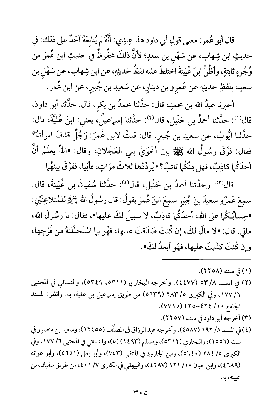 قال أبو عُمر: معنى قولِ أبي داود هذا عِندِي: أنَّهُ لم يُتابِعْهُ أحَدٌ على ذلك: في حديثِ ابن شِهاب، عن سَهْلِ بن سعدٍ؛ لأنَّ ذلكَ محفُوظٌ في حديثِ ابن عُمرَ من وُجُوهٍ ثابتةٍ، وأظُنُّ ابنَ عُيَينةَ اختلطَ عليه لفظُ حَديثِهِ، عن ابن شِهاب، عن سَهْلِ بن سعدٍ، بلفظِ حديثهِ عن عَمرِو بن دينارٍ، عن سَعيدِ بن جُبيرٍ، عن ابن عُمر.