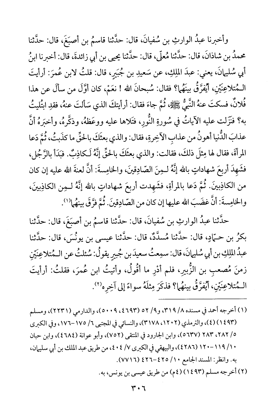 حدَّثنا عبدُ الوارثِ بن سُفيانَ، قال: حدَّثنا قاسمُ بن أصبَغَ، قال: حدَّثنا بكرُ بن حمّادٍ، قال: حدَّثنا مُسدَّدٌ، قال: حدَّثنا عيسى بن يونُسَ، قال: حدَّثنا عبدُ الملِكِ بن أبي سُليمانَ، قال: سمِعتُ سعيدَ بن جُبيرٍ يقولُ: سُئلتُ عن المُتلاعِنَيْنِ زمنَ مُصعبِ بن الزُّبيرِ، فلم أدْرِ ما أقُولُ، وأتيتُ ابن عُمرَ، فقلتُ: أرأيتَ المُتلاعِنَيْنِ، أيُفرَّقُ بينهُما؟ فذكَرَ مِثلَهُ سواءً إلى آخِرِه (¬٢).
