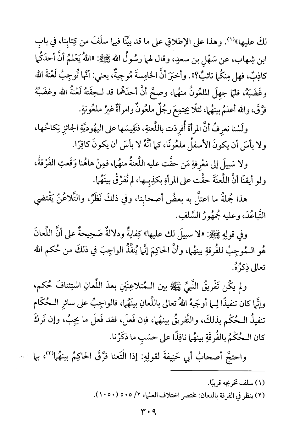 ولم يكُن تَفْريقُ النَّبيِّ -صلى الله عليه وسلم- بين المُتلاعِنَيْنِ بعدَ اللِّعانِ اسْتِئنافَ حُكم، وإنَّما كان تنفيذًا لِما أوجَبهُ اللهُ تعالى باللِّعانِ بينَهُما، فالواجِبُ على سائرِ الحُكّام تنفيذُ الحُكْم بذلكَ، والتَّفريقُ بينهُما، فإن فَعلَ، فقد فَعلَ ما يجِبُ، وإن تَركَ كان الحُكْمُ بالفُرقَةِ بينهُما نافِذًا على حسَبِ ما ذكَرْنا.