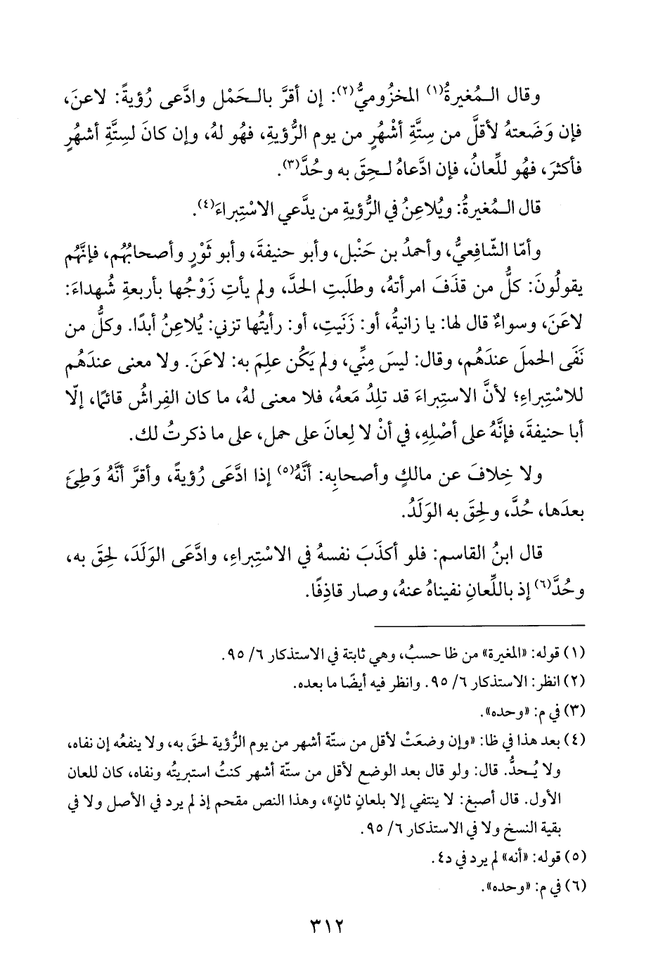 (¬٤) بعد هذا في ظا: "وإن وضعَتْ لأقل من ستّة أشهر من يوم الرُّؤية لحقَ به، ولا ينفعُه إن نفاه، ولا يُحدُّ. قال: ولو قال بعد الوضع لأقل من ستّة أشهر كنتُ استبريتُه ونفاه، كان للعان الأول. قال أصبغ: لا ينتفي إلا بلعانٍ ثانٍ"، وهذا النص مقحم إذ لم يرد في الأصل ولا في بقية النسخ ولا في الاستذكار ٦/ ٩٥.