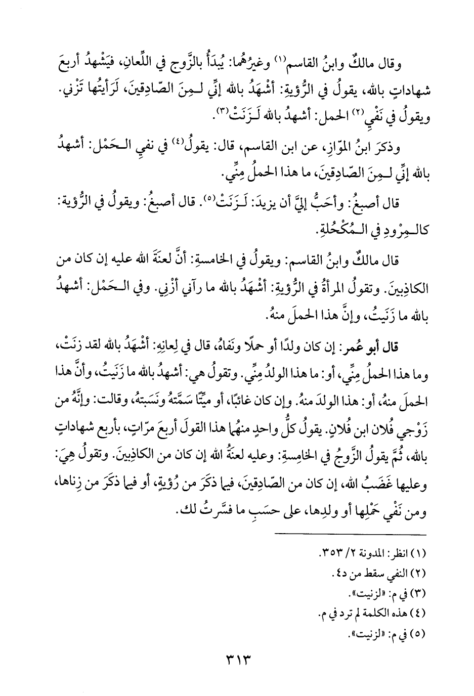 قال مالكٌ وابنُ القاسم: ويقولُ في الخامسةِ: أنَّ لعنَةَ الله عليه إن كان من الكاذِبينَ. وتقولُ المرأةُ في الرُّؤيةِ: أشْهَدُ بالله ما رآني أزْنِي. وفي الحَمْل: أشهدُ بالله ما زَنَيتُ، وإنَّ هذا الحملَ منهُ.