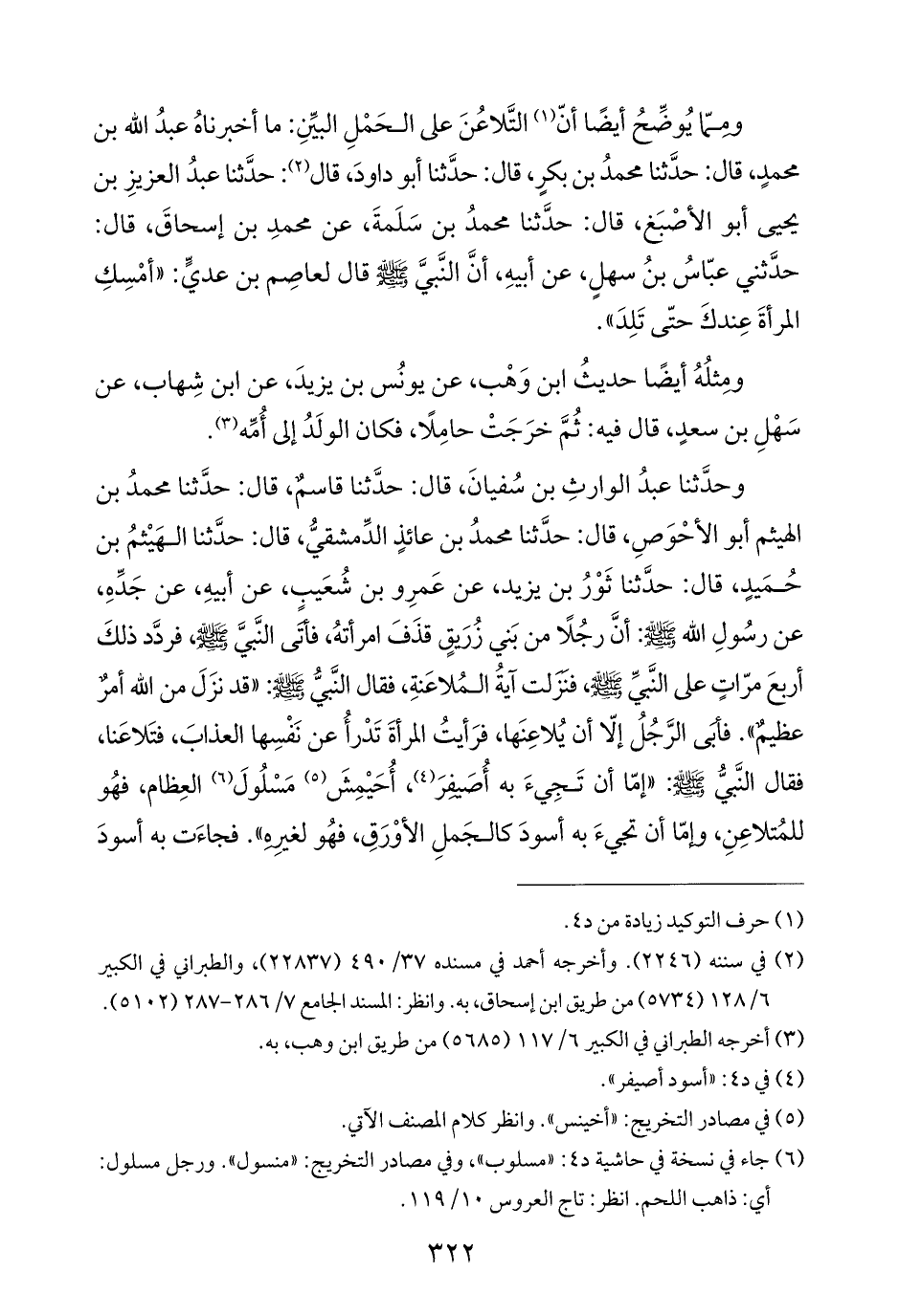 وحدَّثنا عبدُ الوارثِ بن سُفيانَ، قال: حدَّثنا قاسمٌ، قال: حدَّثنا محمدُ بن الهيثم أبو الأحْوَصِ، قال: حدَّثنا محمدُ بن عائذٍ الدِّمشقيُّ، قال: حدَّثنا الهَيْثمُ بن حُمَيدٍ، قال: حدَّثنا ثَوْرُ بن يزيد، عن عَمرِو بن شُعَيب، عن أبيهِ، عن جَدِّهِ، عن رسُولِ الله -صلى الله عليه وسلم-: أنَّ رجُلًا من بَني زُرَيقٍ قذَفَ امرأتهُ، فأتَى النَّبيَّ -صلى الله عليه وسلم-, فردَّد ذلكَ أربعَ مرّاتٍ على النَّبيِّ -صلى الله عليه وسلم-، فنزلت آيةُ المُلاعَنةِ، فقال النَّبيُّ -صلى الله عليه وسلم-: "قد نزَلَ من الله أمرٌ عظيمٌ". فأبَى الرَّجُلُ إلّا أن يُلاعِنَها، فرَأيتُ المرأةَ تَدْرأُ عن نَفْسِها العذابَ، فتَلاعَنا، فقال النَّبيُّ -صلى الله عليه وسلم-: "إمّا أن تَجِيءَ به أُصَيفِرَ (¬٤)، أُحَيْمِشَ (¬٥) مَسْلُولَ (¬٦) العِظام، فهُو للمُتلاعِنِ، وإمّا أن تجيءَ به أسودَ كالجَملِ الأوْرَقِ، فهُو لغيرِهِ". فجاءَت به أسودَ