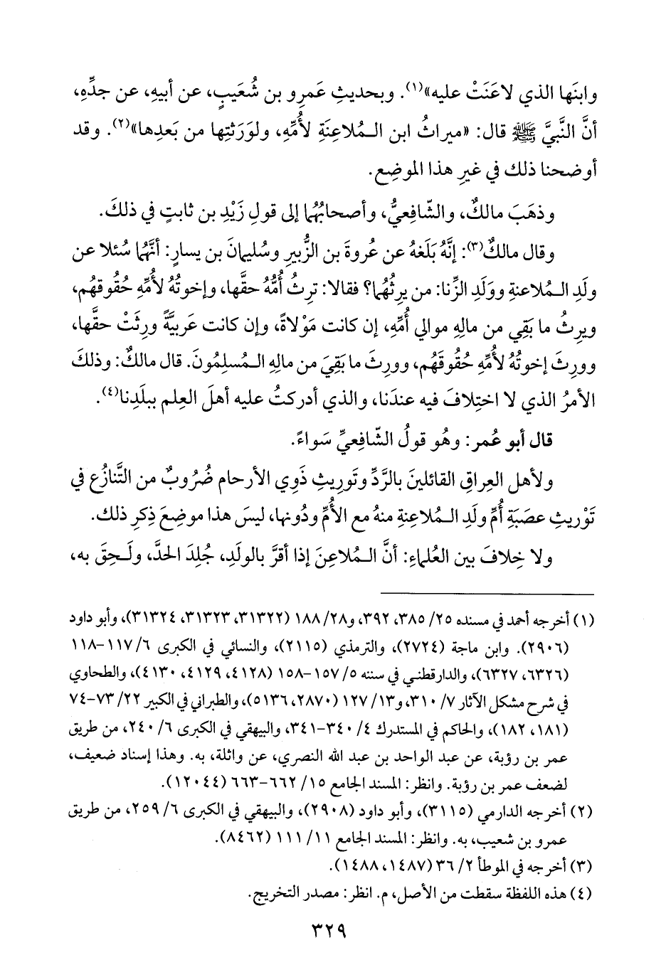 وابنَها الذي لاعَنَتْ عليه" (¬١). وبحديثِ عَمرِو بن شُعَيبٍ، عن أبيهِ، عن جدِّهِ، أنَّ النَّبيَّ -صلى الله عليه وسلم- قال: "ميراثُ ابن المُلاعِنَةِ لأُمِّهِ، ولوَرَثتِها من بَعدِها" (¬٢). وقد أوضحنا ذلك في غيرِ هذا الموضِع.