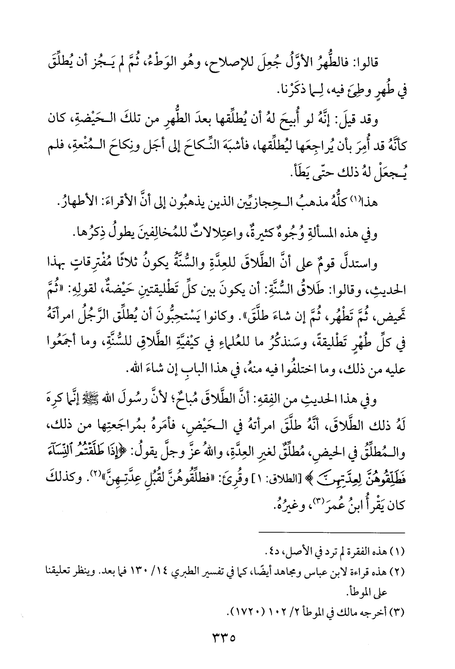 واستدلَّ قومٌ على أنَّ الطَّلاقَ للعِدَّةِ والسُّنَّةُ يكونُ ثلاثًا مُفْترِقاتٍ بهذا الحديثِ، وقالوا: طَلاقُ السُّنَّةِ: أن يكونَ بين كلِّ تَطْليقتينِ حَيْضةٌ، لقولِهِ: "ثُمَّ تَحيض، ثُمَّ تَطْهُر، ثُمَّ إن شاءَ طلَّقَ". وكانوا يَسْتحِبُّونَ أن يُطلِّق الرَّجُلُ امرأتَهُ في كلِّ طُهْرٍ تَطْليقةً، وسَنذكُرُ ما للعُلماءِ في كيْفيَّةِ الطَّلاقِ للسُّنَّةِ، وما أجمَعُوا عليه من ذلك، وما اختلفُوا فيه منهُ، في هذا البابِ إن شاءَ الله.
