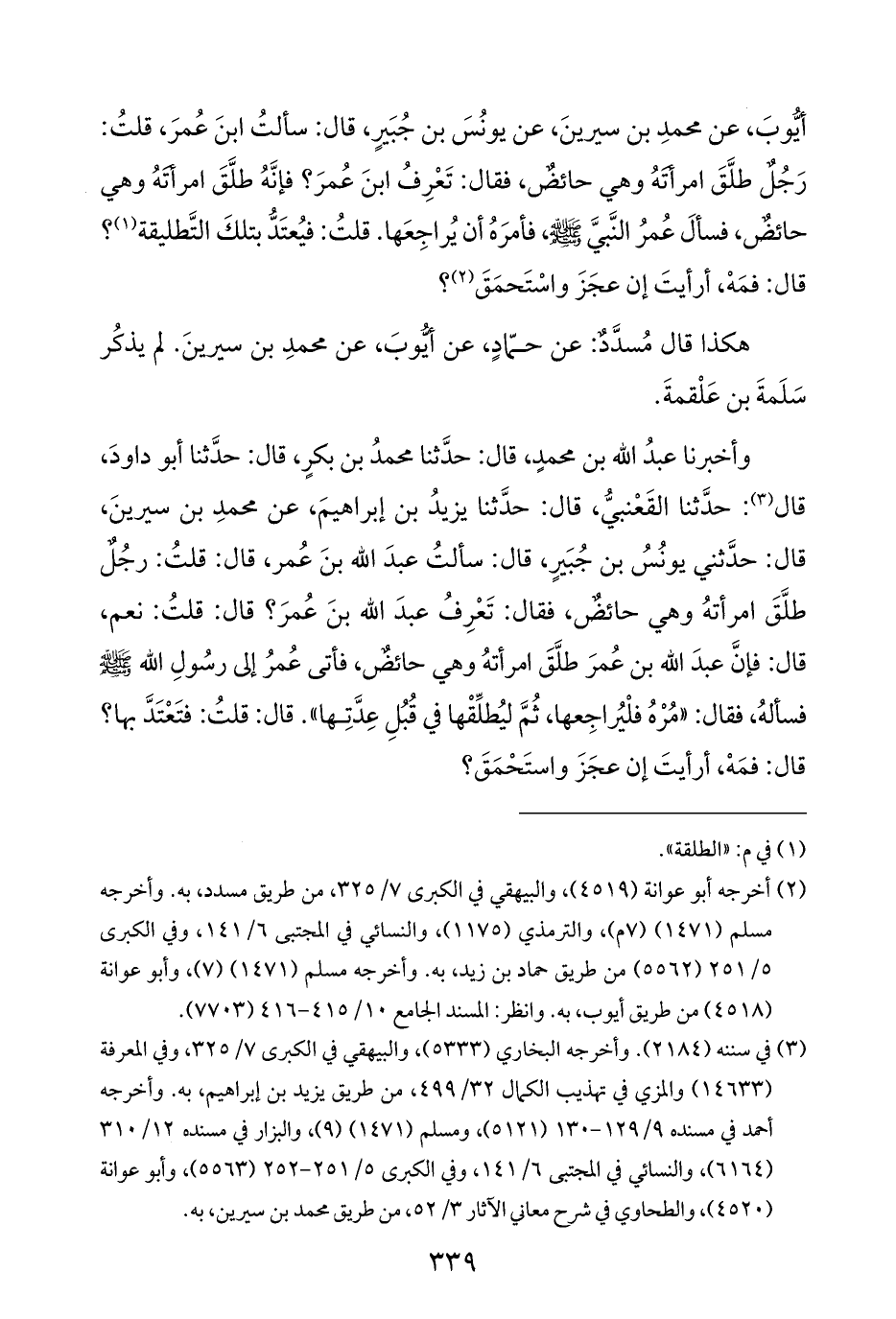 وأخبرنا عبدُ الله بن محمدٍ، قال: حدَّثنا محمدُ بن بكرٍ، قال: حدَّثنا أبو داودَ، قال (¬٣): حدَّثنا القَعْنبيُّ، قال: حدَّثنا يزيدُ بن إبراهيمَ، عن محمدِ بن سيرينَ، قال: حدَّثني يونُسُ بن جُبَيرٍ، قال: سألتُ عبدَ الله بنَ عُمر، قال: قلتُ: رجُلٌ طلَّقَ امرأتهُ وهي حائضٌ، فقال: تَعْرِفُ عبدَ الله بنَ عُمرَ؟ قال: قلتُ: نعم، قال: فإنَّ عبدَ الله بن عُمرَ طلَّقَ امرأتهُ وهي حائضٌ، فأتى عُمرُ إلى رسُولِ الله -صلى الله عليه وسلم- فسألهُ، فقال: "مُرْهُ فلْيُراجِعها، ثُمَّ ليُطلِّقْها في قُبُلِ عِدَّتِها". قال: قلتُ: فتَعْتَدَّ بها؟ قال: فمَهْ، أرأيتَ إن عجَزَ واستَحْمَقَ؟