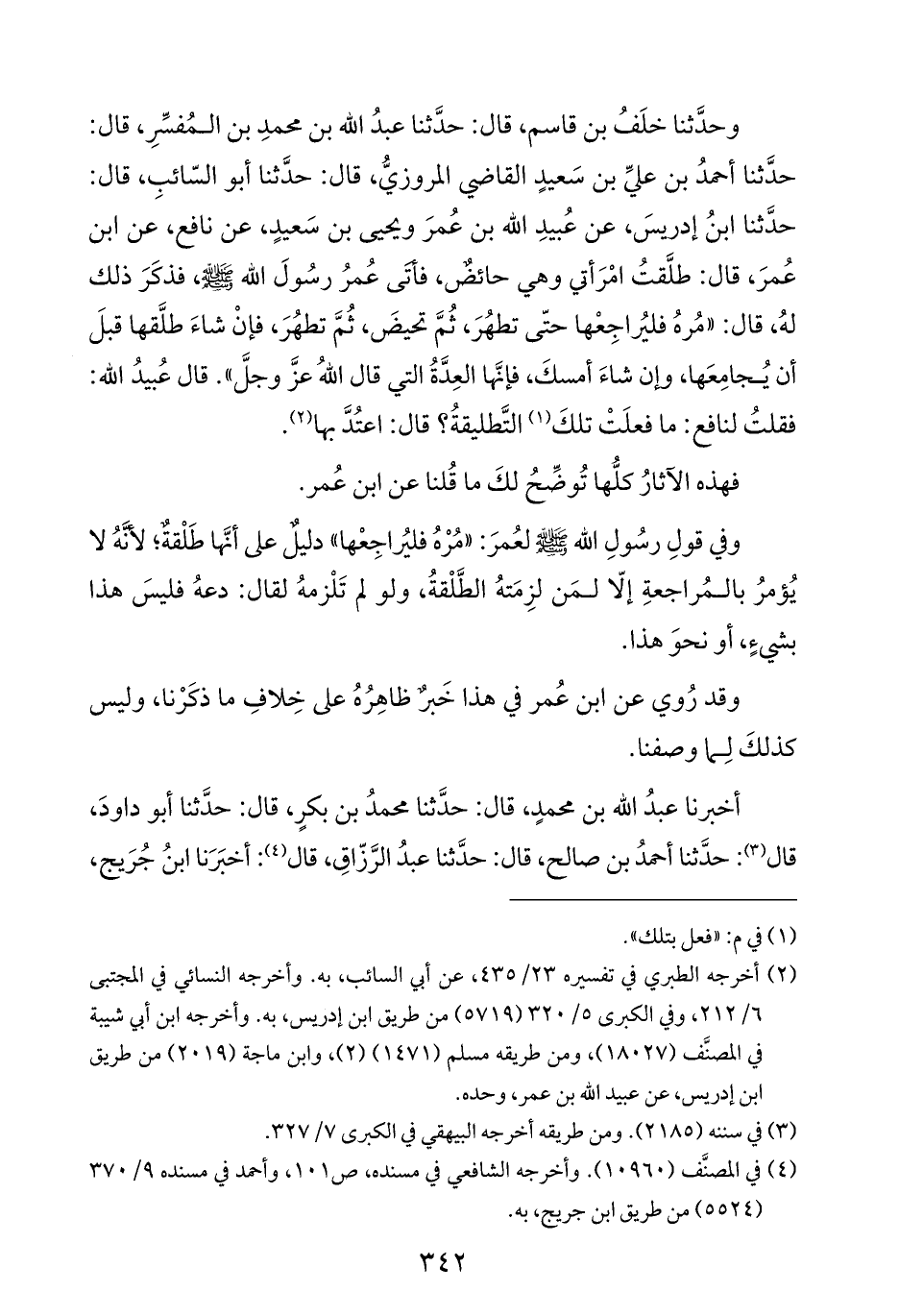 وحدَّثنا خلَفُ بن قاسم، قال: حدَّثنا عبدُ الله بن محمدِ بن المُفسِّرِ، قال: حدَّثنا أحمدُ بن عليِّ بن سَعيدٍ القاضي المروزيُّ، قال: حدَّثنا أبو السّائبِ، قال: حدَّثنا ابنُ إدريسَ، عن عُبيدِ الله بن عُمرَ ويحيى بن سَعيدٍ، عن نافع، عن ابن عُمرَ، قال: طلَّقتُ امْرَأتي وهي حائضٌ، فأتَى عُمرُ رسُولَ الله -صلى الله عليه وسلم-، فذكَرَ ذلك لهُ، قال: "مُرهُ فليُراجِعْها حتّى تطهُرَ، ثُمَّ تحيضَ، ثُمَّ تطهُرَ، فإنْ شاءَ طلَّقها قبلَ أن يُجامِعَها، وإن شاءَ أمسكَ، فإنَّها العِدَّةُ التي قال اللهُ عزَّ وجلَّ". قال عُبيدُ الله: فقلتُ لنافع: ما فعلَتْ تلكَ (¬١) التَّطليقةُ؟ قال: اعتُدَّ بها (¬٢).