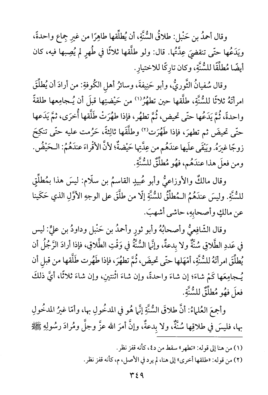 وقال مالكٌ والأوزاعيُّ وأبو عُبيدٍ القاسمُ بن سلّام: ليسَ هذا بمُطلِّقٍ للسُّنَّةِ. وليسَ عندَهُمُ المُطلِّقُ للسُّنَّةِ إلّا من طلَّقَ على الوجهِ الأوَّلِ الذي حَكَينا عن مالكٍ وأصحابِهِ، حاشى أشهبَ.