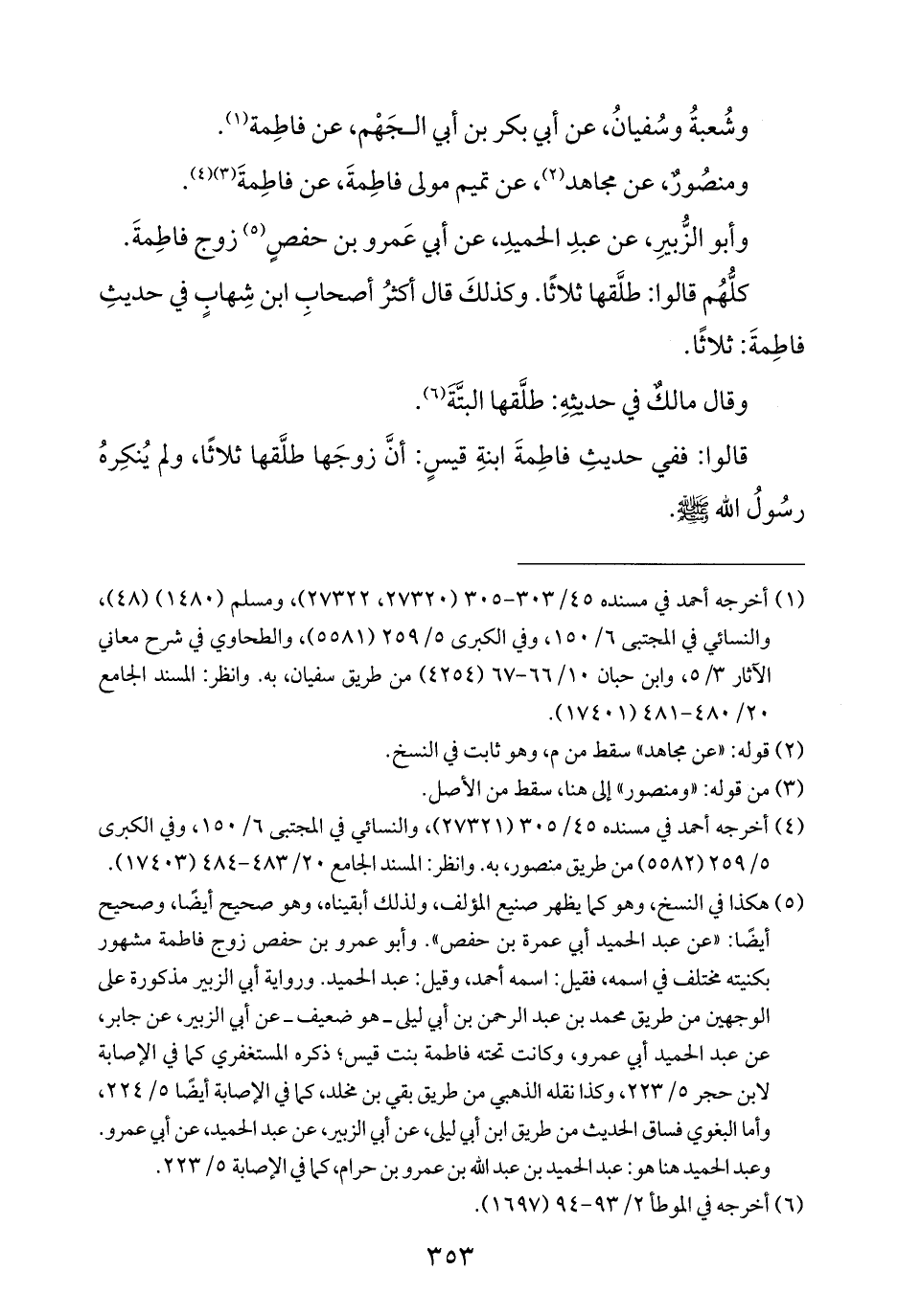 (¬٥) هكذا في النسخ، وهو كما يظهر صنيع المؤلف، ولذلك أبقيناه، وهو صحيح أيضًا، وصحيح أيضًا: "عن عبد الحميد أبي عمرة بن حفص". وأبو عمرو بن حفص زوج فاطمة مشهور بكنيته مختلف في اسمه، فقيل: اسمه أحمد، وقيل: عبد الحميد. ورواية أبي الزبير مذكورة على الوجهين من طريق محمد بن عبد الرحمن بن أبي ليلى -هو ضعيف- عن أبي الزبير، عن جابر، عن عبد الحميد أبي عمرو، وكانت تحته فاطمة بنت قيس؛ ذكره المستغفري كما في الإصابة لابن حجر ٥/ ٢٢٣، وكذا نقله الذهبي من طريق بقي بن مخلد، كما في الإصابة أيضًا ٥/ ٢٢٤، وأما البغوي فساق الحديث من طريق ابن أبي ليلى، عن أبي الزبير، عن عبد الحميد، عن أبي عمرو. وعبد الحميد هنا هو: عبد الحميد بن عبد الله بن عمرو بن حرام، كما في الإصابة ٥/ ٢٢٣.