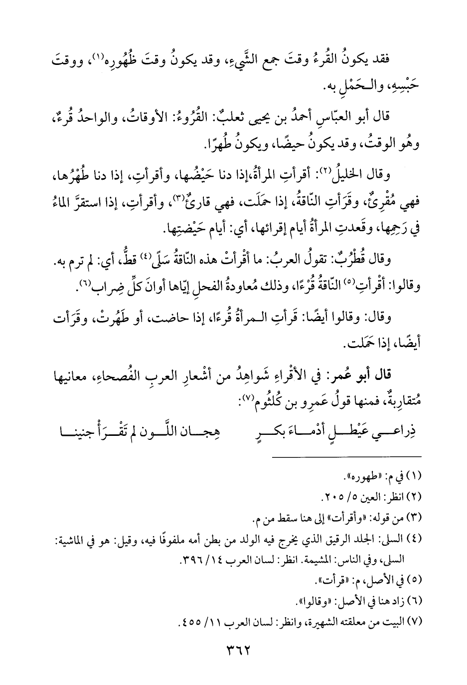 قال أبو عُمر: في الأقْراءِ شَواهِدُ من أشْعارِ العرب الفُصحاءِ، معانيها مُتقارِبةٌ، فمنها قولُ عَمرِو بن كُلثُوم (¬٧):