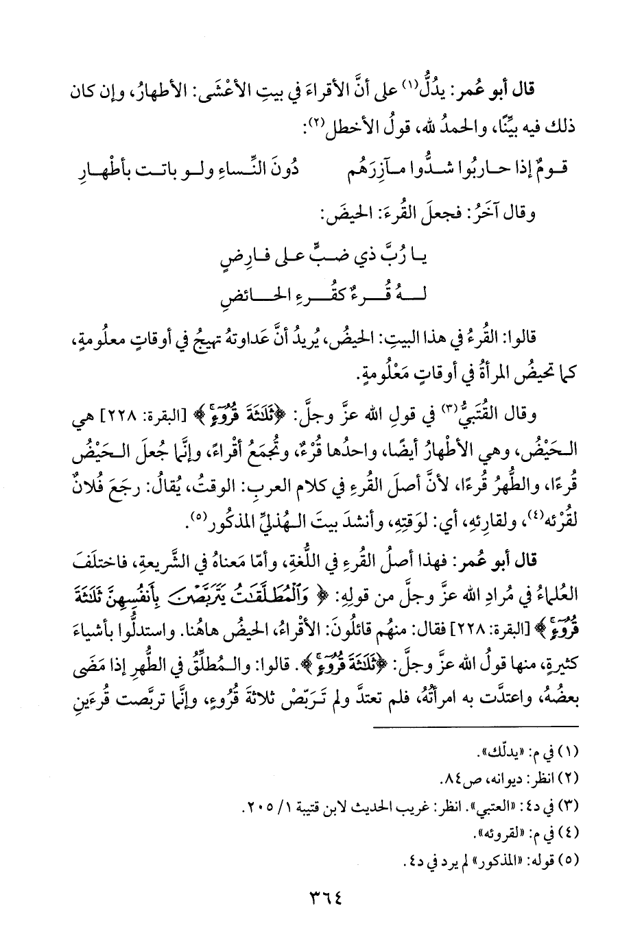 قالوا: القُرءُ في هذا البيتِ: الحيضُ، يُريدُ أنَّ عَداوتهُ تهيجُ في أوقاتٍ معلُومةٍ، كما تحيضُ المرأةُ في أوقاتٍ مَعْلُومةٍ.