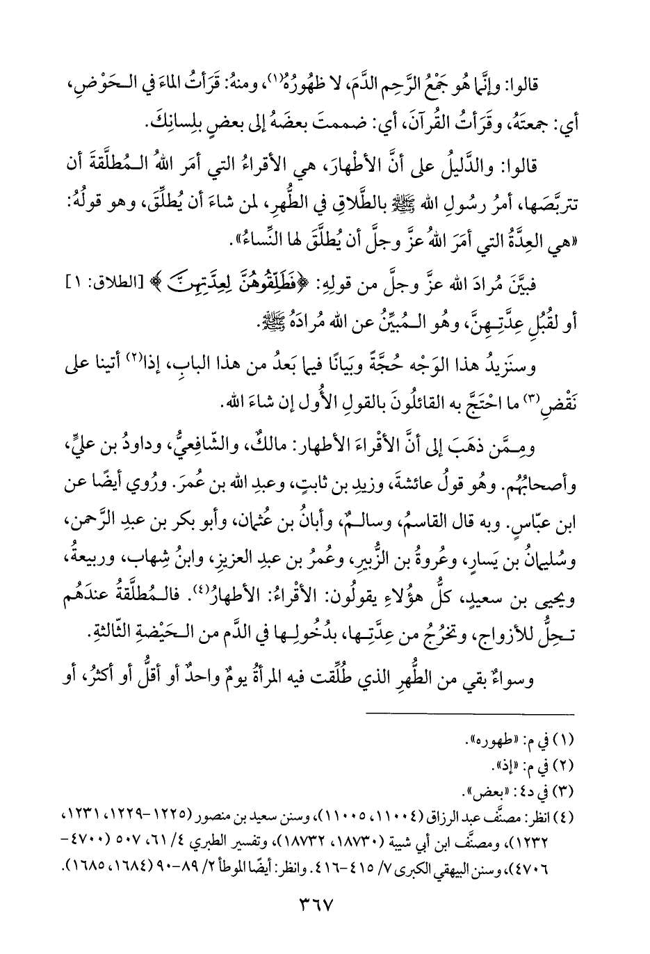 ومِمَّن ذهَبَ إلى أنَّ الأقْراءَ الأطهار: مالكٌ، والشّافِعيُّ، وداودُ بن عليٍّ، وأصحابُهُم. وهُو قولُ عائشةَ، وزيدِ بن ثابتٍ، وعبدِ الله بن عُمرَ. ورُوي أيضًا عن ابن عبّاسٍ. وبه قال القاسمُ، وسالمٌ وأبانُ بن عُثمان، وأبو بكر بن عبدِ الرَّحمن، وسُليمانُ بن يَسارٍ، وعُروةُ بن الزُّبيرِ، وعُمرُ بن عبدِ العزيزِ، وابنُ شِهاب، وربيعةُ، ويحيى بن سعيدٍ، كلُّ هؤُلاءِ يقولُون: الأقْراءُ: الأطهارُ (¬٤). فالمُطلَّقةُ عندَهُم تحِلُّ للأزواج، وتخرُجُ من عِدَّتِها، بدُخُولِها في الدَّم من الحَيْضةِ الثّالثةِ.