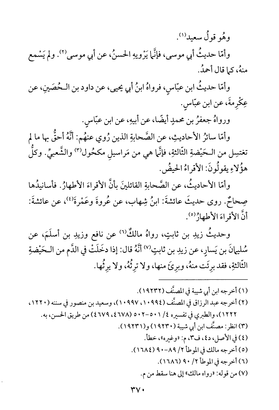 وأمّا سائرُ الأحاديثِ، عن الصَّحابةِ الذين رُوي عنهُم: أنَّهُ أحقُّ بها ما لم تغتسِل من الحَيْضةِ الثّالثةِ، فإنَّما هي من مَراسيلِ مكحُول (¬٣) والشَّعبيِّ. وكلُّ هؤُلاءِ يقولُونَ: الأقراءُ الحيضُ.