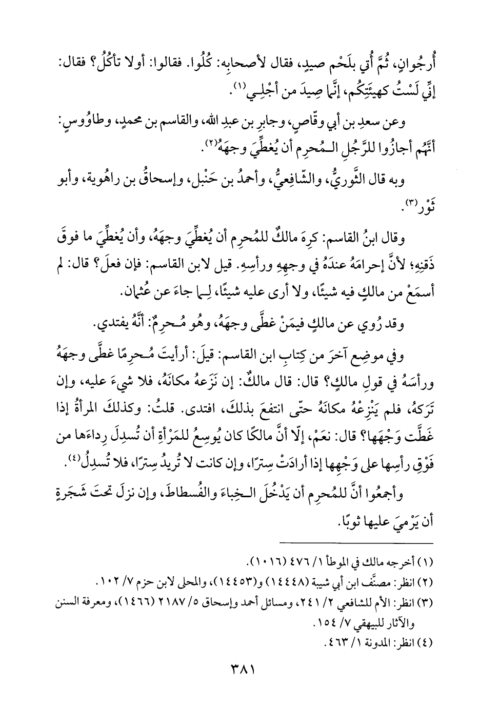 وعن سعدِ بن أبي وقّاصٍ، وجابرِ بن عبدِ الله، والقاسم بن محمدٍ، وطاوُوسٍ: أنَّهُم أجازُوا للرَّجُلِ المُحرِم أن يُغطِّيَ وجهَهُ (¬٢).