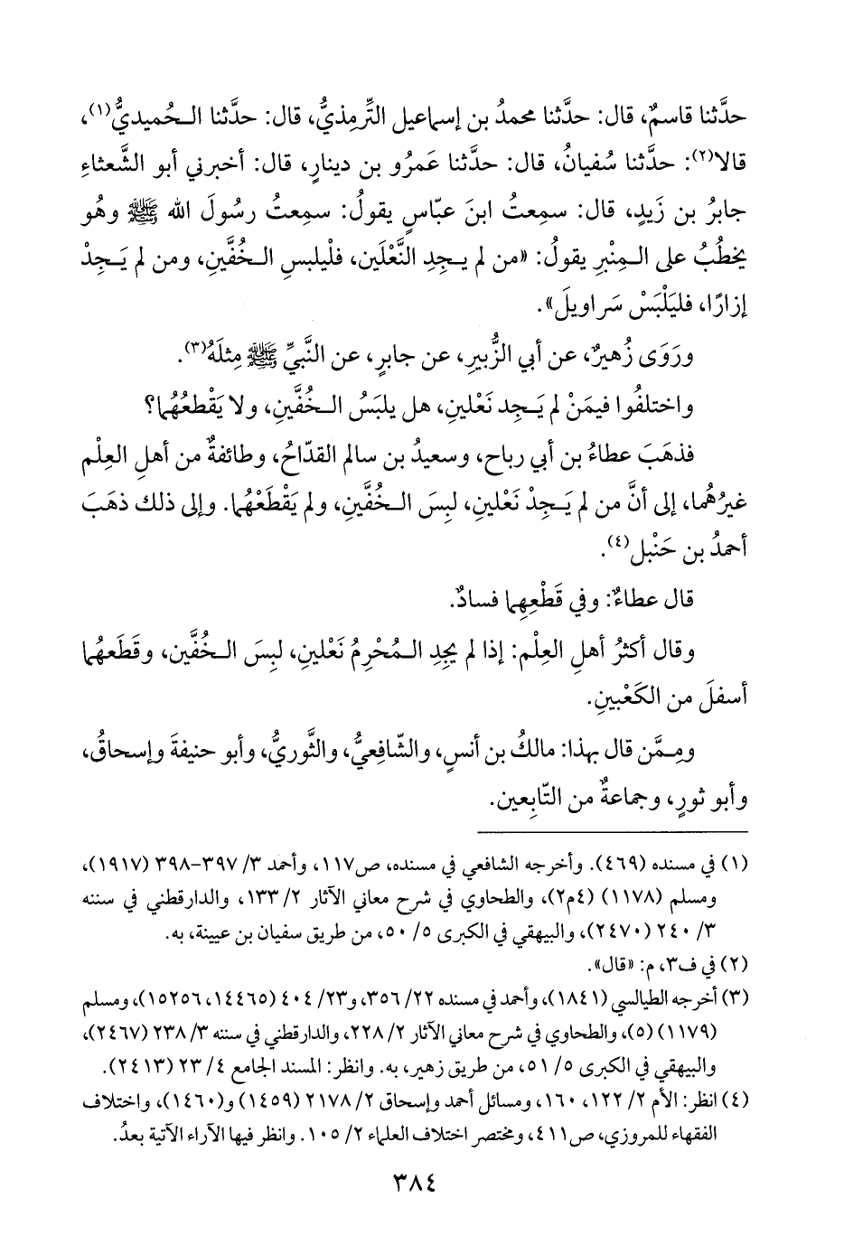 حدَّثنا قاسمٌ، قال: حدَّثنا محمدُ بن إسماعيل التِّرمِذيُّ، قال: حدَّثنا الحُميديُّ (¬١)، قالا (¬٢): حدَّثنا سُفيانُ، قال: حدَّثنا عَمرُو بن دينارٍ، قال: أخبرني أبو الشَّعثاءِ جابرُ بن زَيدٍ، قال: سمِعتُ ابنَ عبّاسٍ يقولُ: سمِعتُ رسُولَ الله -صلى الله عليه وسلم- وهُو يخطُبُ على المِنْبرِ يقولُ: "من لم يجِدِ النَّعْلَين، فلْيلبسِ الخُفَّينِ، ومن لم يَجِدْ إزارًا، فليَلْبَسْ سَراويلَ".