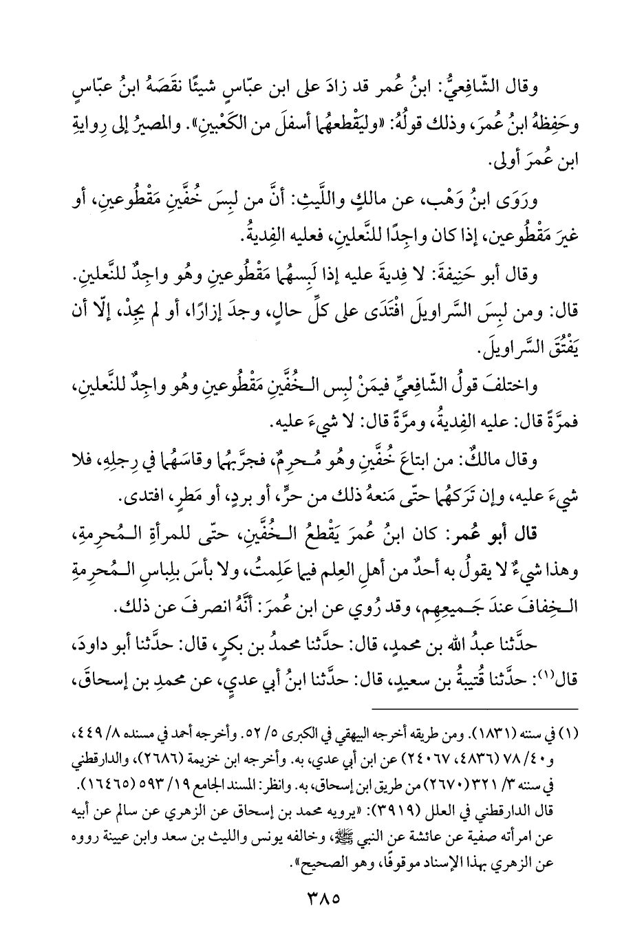 قال أبو عُمر: كان ابنُ عُمرَ يَقْطعُ الخُفَّينِ، حتّى للمرأةِ المُحرِمةِ، وهذا شيءٌ لا يقولُ به أحدٌ من أهلِ العِلم فيما عَلِمتُ، ولا بأسَ بلِباسِ المُحرِمةِ الخِفافَ عندَ جَميعِهِم، وقد رُوي عن ابن عُمرَ: أنَّهُ انصرفَ عن ذلك.