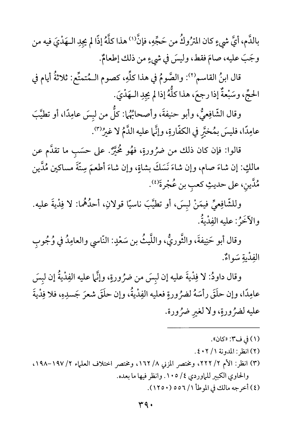 وقال الشّافِعيُّ، وأبو حنيفةَ، وأصحابُهُما: كلُّ من لبِسَ عامِدًا، أو تطيَّبَ عامِدًا، فليسَ بمُخيَّرٍ في الكفّارةِ، وإنَّما عليه الدَّمُ لا غيرُ (¬٣).