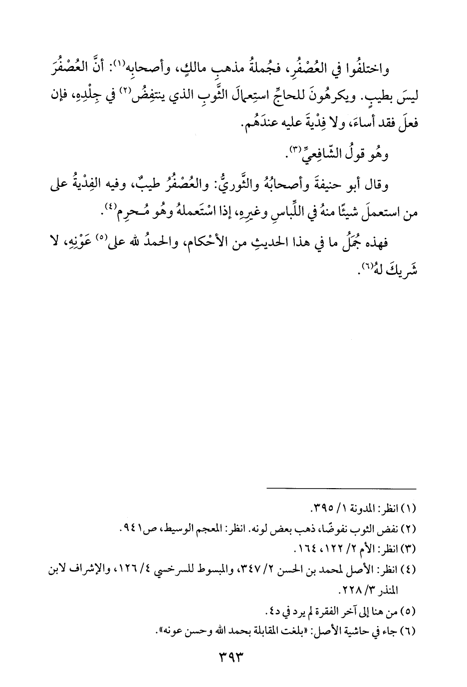 وقال أبو حنيفةَ وأصحابُهُ والثَّوريُّ: والعُصْفُرُ طيبٌ، وفيه الفِدْيةُ على من استعملَ شيئًا منهُ في اللِّباسِ وغيرِهِ، إذا اسْتَعملهُ وهُو مُحرِم (¬٤).