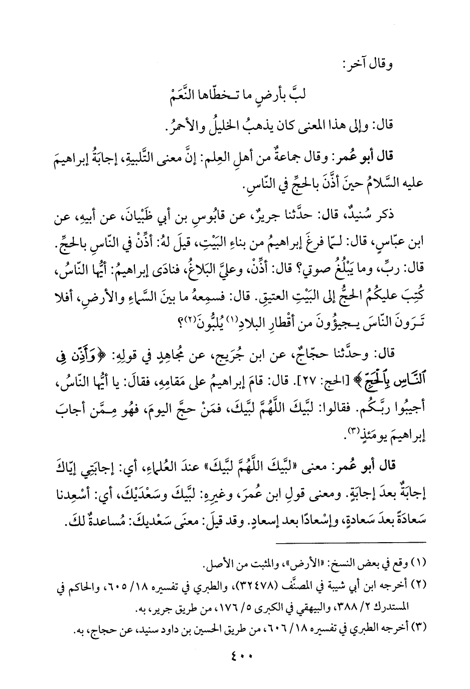 قال أبو عُمر: وقال جماعة من أهلِ العِلم: إنَّ معنى التَّلبيةِ، إجابَةُ إبراهيمَ عليه السَّلامُ حينَ أذَّنَ بالحجِّ في النّاسِ.