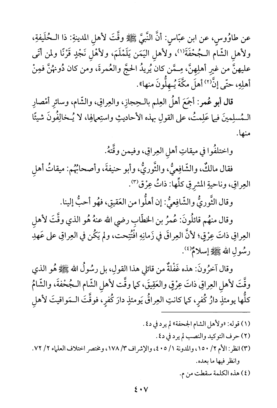 فقال مالكٌ، والشّافِعيُّ، والثَّوريُّ، وأبو حنيفةَ، وأصحابُهُم: ميقاتُ أهلِ العِراقِ، وناحيةِ المشرِقِ كلِّها: ذاتُ عِرْق (¬٣).