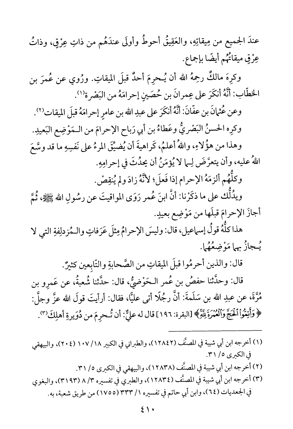 قال: وحدَّثنا حفصُ بن عُمر الحَوْضيُّ، قال: حدَّثنا شُعبةُ، عن عَمرِو بن مُرَّةَ، عن عبدِ الله بن سَلَمةَ: أنَّ رجُلًا أتى عليًّا، فقال: أرأيتَ قولَ الله عزَّ وجلَّ: {وَأَتِمُّوا الْحَجَّ وَالْعُمْرَةَ لِلَّهِ} [البقرة: ١٩٦] قال له عليٌّ: أن تُحرِمَ من دُوَيرةِ أهلِكَ (¬٣).
