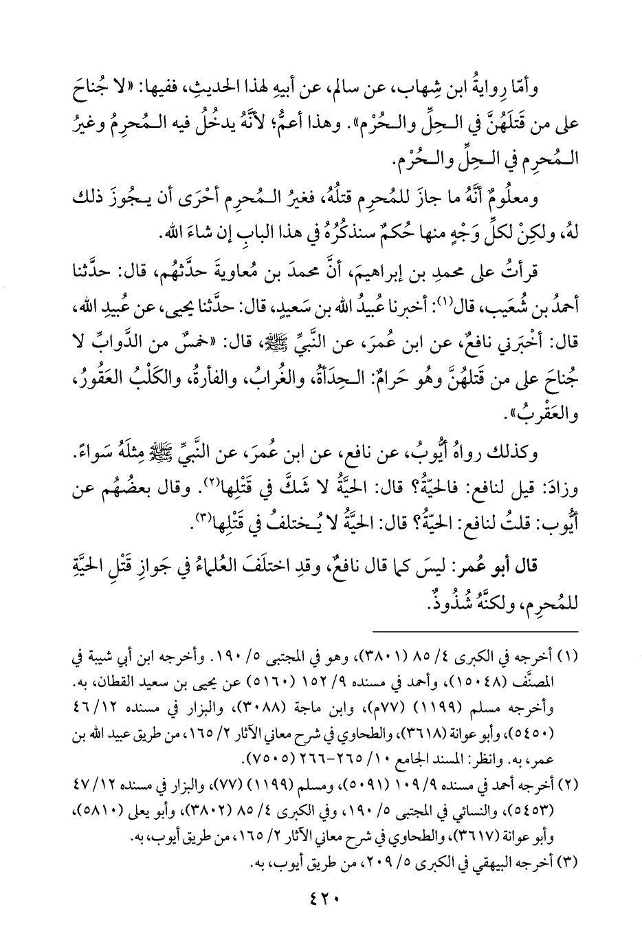 قال أبو عُمر: ليسَ كما قال نافعٌ، وقدِ اختلَفَ العُلماءُ في جَوازِ قَتْلِ الحيَّةِ للمُحرِم، ولكنَّهُ شُذُوذٌ.
