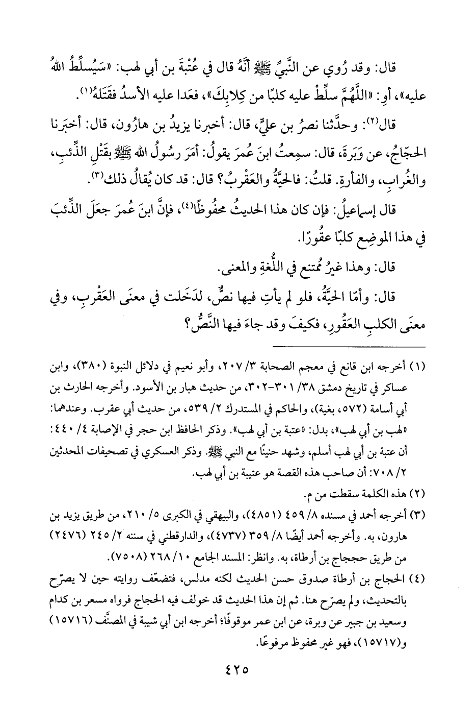 قال: وأمّا الحيَّةُ، فلو لم يأتِ فيها نصٌّ، لدَخَلت في معنَى العَقْربِ، وفي معنَى الكلبِ العَقُورِ، فكيفَ وقد جاءَ فيها النَّصُّ؟