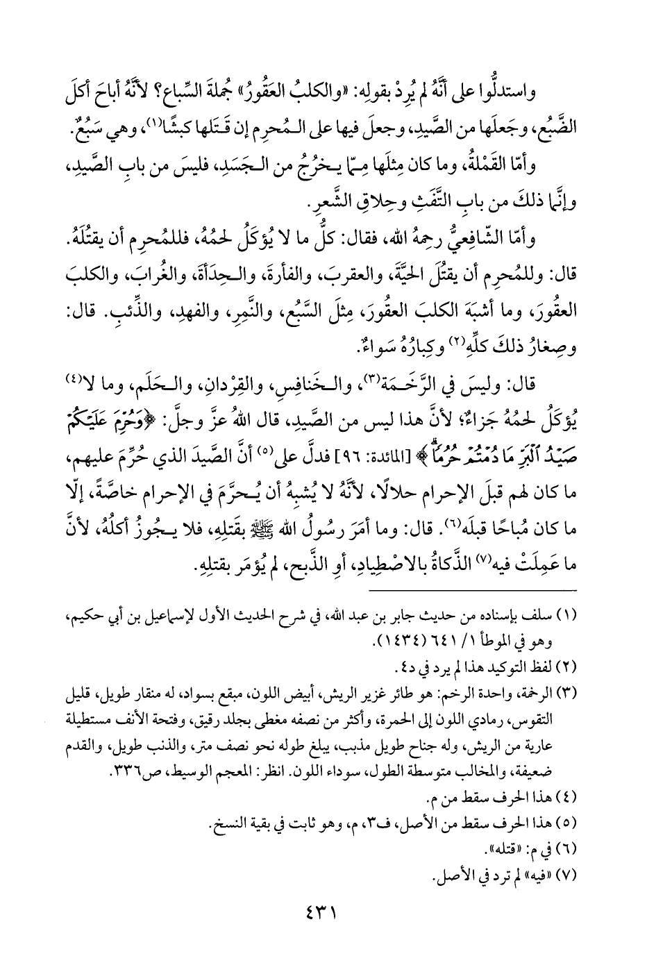 قال: وليسَ في الرَّخَمَة (¬٣)، والخَنافِسِ، والقِرْدانِ، والحَلَم، وما لا (¬٤) يُؤكَلُ لحمُهُ جَزاءٌ؛ لأنَّ هذا ليس من الصَّيدِ، قال اللهُ عزَّ وجلَّ: م {وَحُرِّمَ عَلَيْكُمْ صَيْدُ الْبَرِّ مَا دُمْتُمْ حُرُمًا} [المائدة: ٩٦] فدلَّ على (¬٥) أنَّ الصَّيدَ الذي حُرِّمَ عليهم، ما كان لهم قبلَ الإحرام حلالًا، لأنَّهُ لا يُشبِهُ أن يُحرَّمَ في الإحرام خاصَّةً، إلّا ما كان مُباحًا قبلَه (¬٦). قال: وما أمَرَ رسُولُ الله -صلي الله عليه وسلم- بقَتلِهِ، فلا يجُوزُ أكلُهُ، لأنَّ ما عَمِلَتْ فيه (¬٧) الذَّكاةُ بالاصْطِيادِ، أوِ الذَّبح، لم يُؤمَر بقتلِهِ.