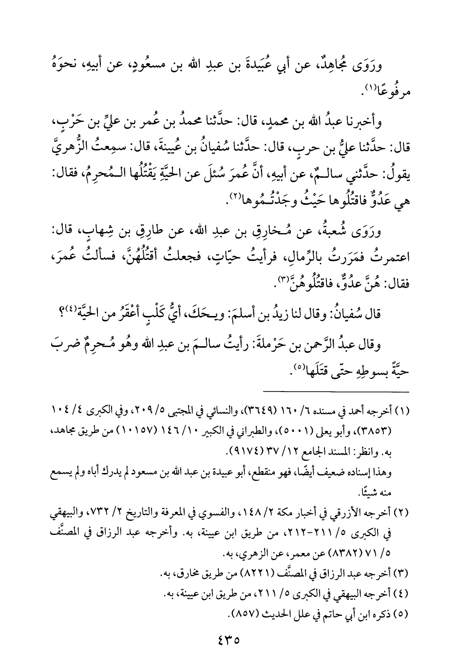 وأخبرنا عبدُ الله بن محمدٍ، قال: حدَّثنا محمدُ بن عُمر بن عليِّ بن حَرْبٍ، قال: حدَّثنا عليُّ بن حربٍ، قال: حدَّثنا سُفيانُ بن عُيينةَ، قال: سمِعتُ الزُّهريَّ يقولُ: حدَّثني سالمٌ، عن أبيهِ، أنَّ عُمرَ سُئلَ عن الحيَّةِ يَقْتُلُها المُحرِمُ، فقال: هي عَدُوّ فاقتُلُوها حَيْثُ وجَدْتُمُوها (¬٢).