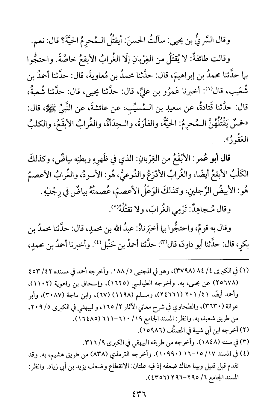 وقالت طائفة: لا يُقتَلُ من الغِرْبانِ إلّا الغُرابُ الأبقعُ خاصَّةً. واحتجُّوا بما حدَّثنا محمدُ بن إبراهيمَ، قال: حدَّثنا محمدُ بن مُعاويةَ، قال: حدَّثنا أحمدُ بن شُعَيب، قال (¬١): أخبرنا عَمرُو بن عليٍّ، قال: حدَّثنا يحيى، قال: حدَّثنا شُعبةُ، قال: حدَّثنا قَتادةُ، عن سعيدِ بن المُسيِّبِ، عن عائشةَ، عن النَّبيِّ -صلي الله عليه وسلم-، قال: "خمسٌ يَقْتُلُهُنَّ المُحرِمُ: الحيَّةُ، والفأرَةُ، والحِدَأةُ، والغُرابُ الأبقَعُ، والكلبُ العَقُورُ".