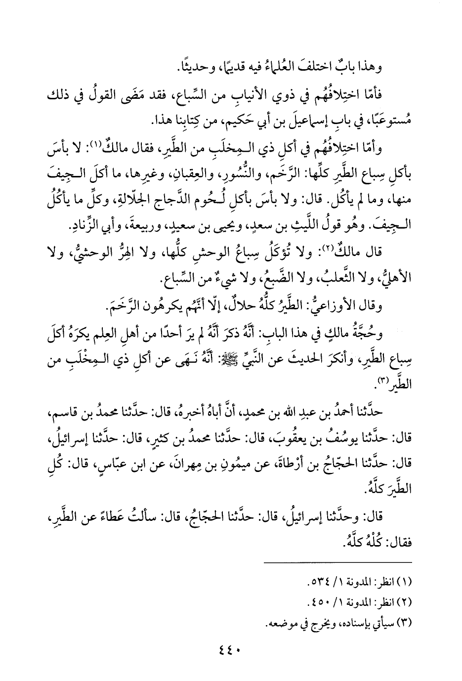 وحُجَّةُ مالكٍ في هذا البابِ: أنَّهُ ذكرَ أنَّهُ لم يرَ أحدًا من أهلِ العِلم يكرَهُ أكلَ سِباع الطَّيرِ، وأنكرَ الحديثَ عن النَّبيِّ -صلي الله عليه وسلم-: أنَّهُ نَهَى عن أكلِ ذي المِخْلَبِ من الطَّير (¬٣).