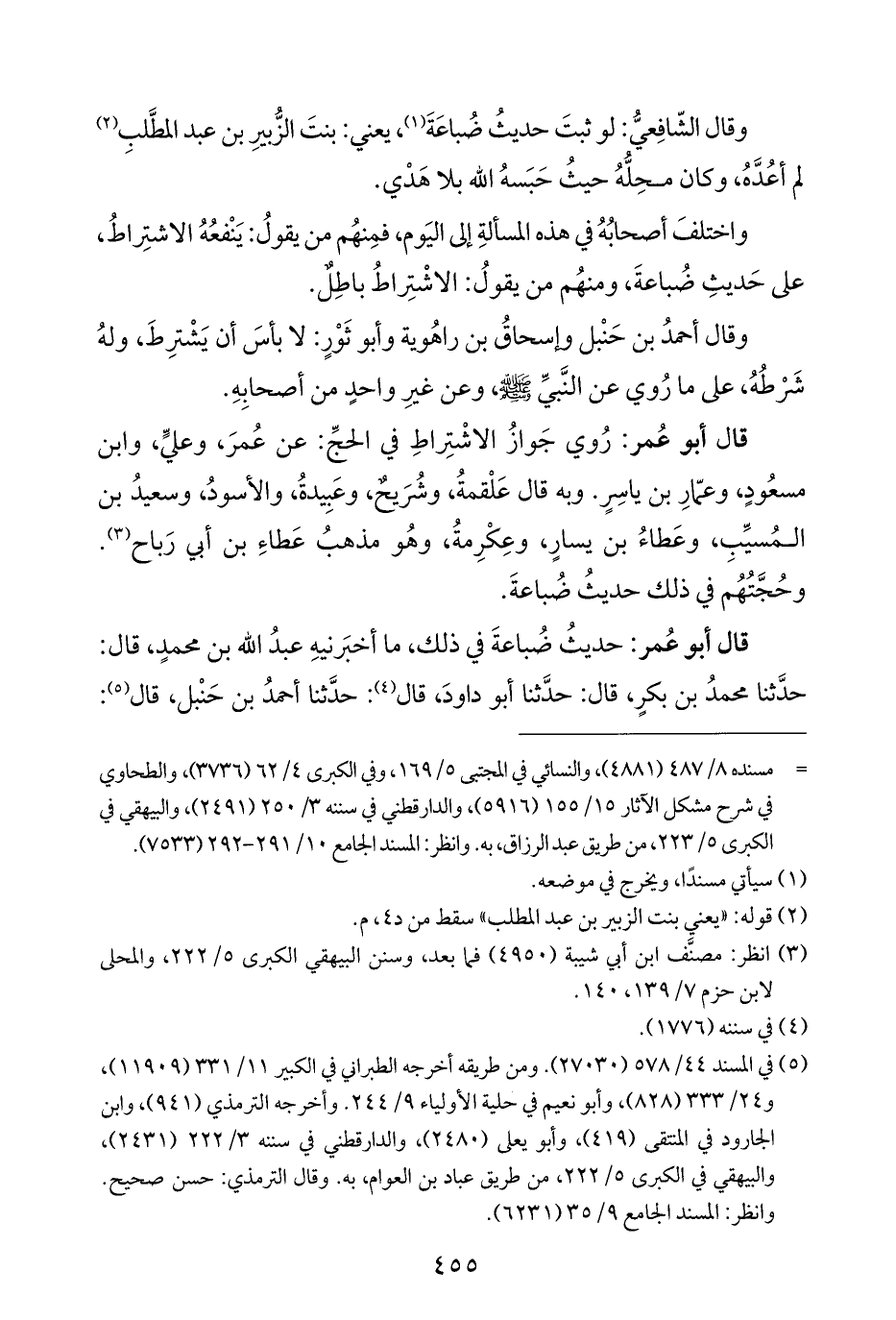 قال أبو عُمر: حديثُ ضُباعةَ في ذلك، ما أخبَرنيهِ عبدُ الله بن محمدٍ، قال: حدَّثنا محمدُ بن بكرٍ، قال: حدَّثنا أبو داودَ، قال (¬٤): حدَّثنا أحمدُ بن حَنْبل، قال (¬٥):