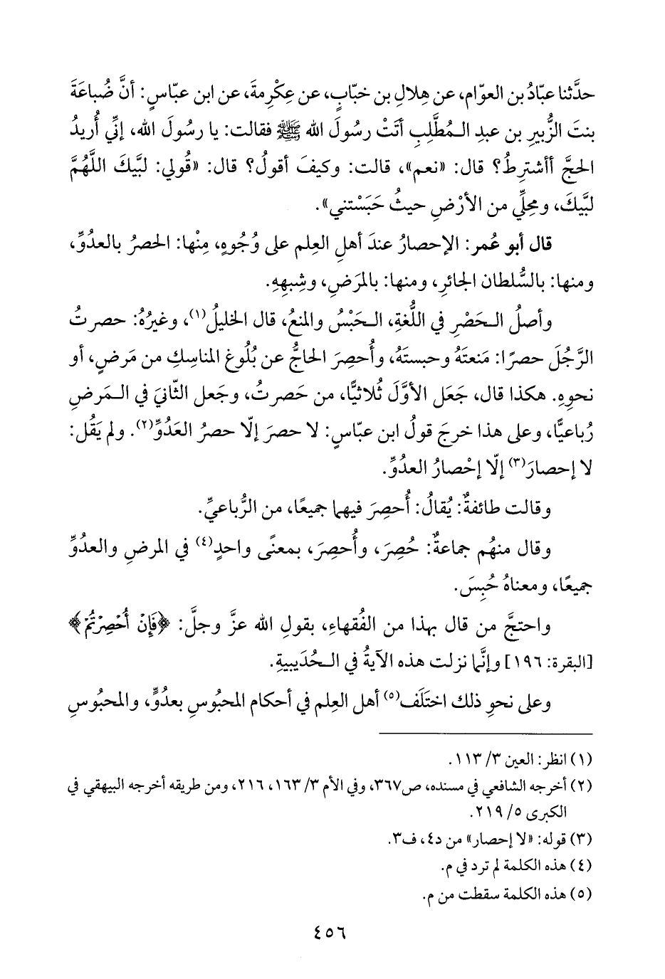 وأصلُ الحَصرِ في اللُّغةِ، الحَبْسُ والمنعُ، قال الخليلُ (¬١)، وغيرُهُ: حصرتُ الرَّجُلَ حصرًا: مَنعتَهُ وحبستَهُ، وأُحصِرَ الحاجُّ عن بُلُوغ المناسِكِ من مَرضٍ، أو نحوِهِ. هكذا قال، جَعَل الأوَّلَ ثُلاثيًّا، من حَصرتُ، وجَعل الثّانيَ في المَرضِ رُباعيًّا، وعلى هذا خرجَ قولُ ابن عبّاسٍ: لا حصرَ إلّا حصرُ العَدُوِّ (¬٢). ولم يَقُل: لا إحصارَ (¬٣) إلّا إحْصارُ العدُوِّ.
