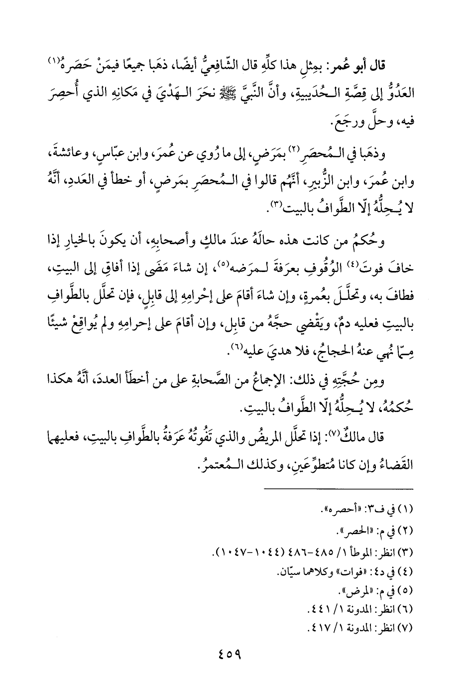 وذهَبا في المُحصَرِ (¬٢) بمَرَضٍ، إلى ما رُوي عن عُمرَ، وابن عبّاسٍ، وعائشةَ، وابن عُمرَ، وابن الزُّبيرِ، أنَّهُم قالوا في المُحصرِ بمَرضٍ، أو خطأ في العَددِ، أنَّهُ لا يُحِلُّهُ إلّا الطَّوافُ بالبيت (¬٣).