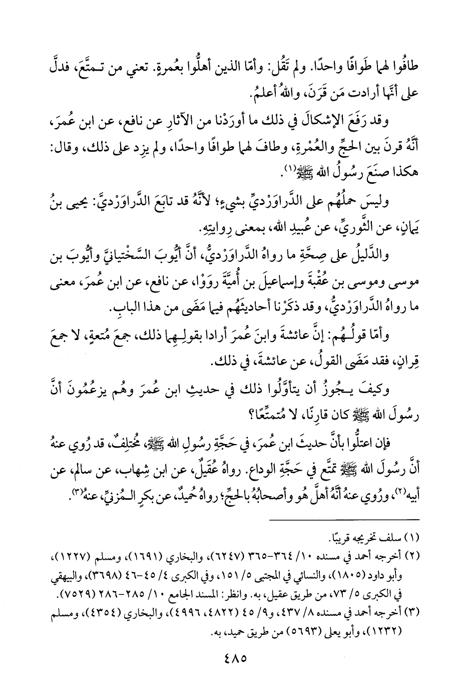 وكيفَ يجُوزُ أن يتأوَّلُوا ذلك في حديثِ ابن عُمرَ وهُم يزعُمُونَ أنَّ رسولَ الله -صلى الله عليه وسلم- كان قارِنًا، لا مُتمتِّعًا؟
