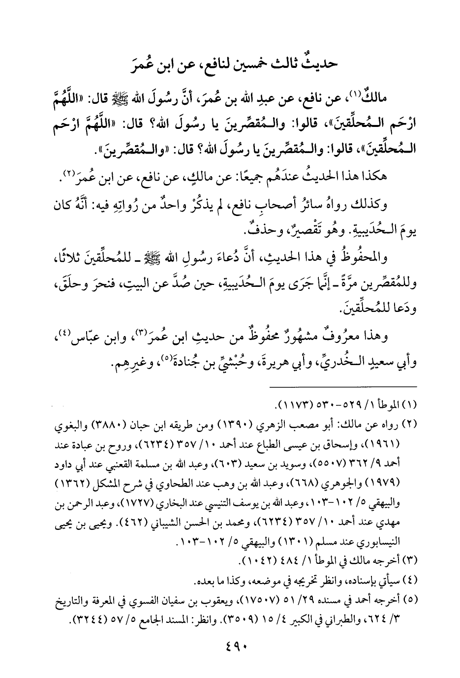 مالكٌ (¬١)، عن نافع، عن عبدِ الله بن عُمرَ، أنَّ رسُولَ الله -صلى الله عليه وسلم- قال: "اللَّهُمَّ ارْحَم المُحلِّقينَ"، قالوا: والمُقصِّرينَ يا رسُولَ الله؟ قال: "اللَّهُمَّ ارْحَم المُحلِّقينَ"، قالوا: والمُقصِّرينَ يا رسُولَ الله؟ قال: "والمُقصِّرينَ".
