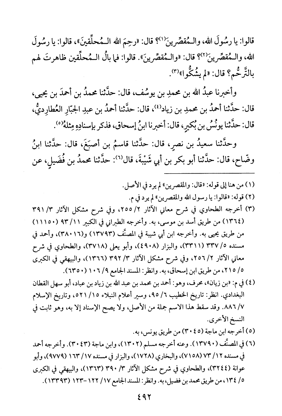 قالوا: يا رسُولَ الله، والمُقصِّرينَ (¬١)؟ قال: "رحِمَ الله المُحلِّقينَ"، قالوا: يا رسُولَ الله، والمُقصِّرينَ (¬٢)؟ قال: "والمُقصِّرينَ". قالوا: فما بالُ المُحلِّقين ظاهرتَ لهم بالتَّرحُّم؟ قال: "لم يشُكُّوا" (¬٣).