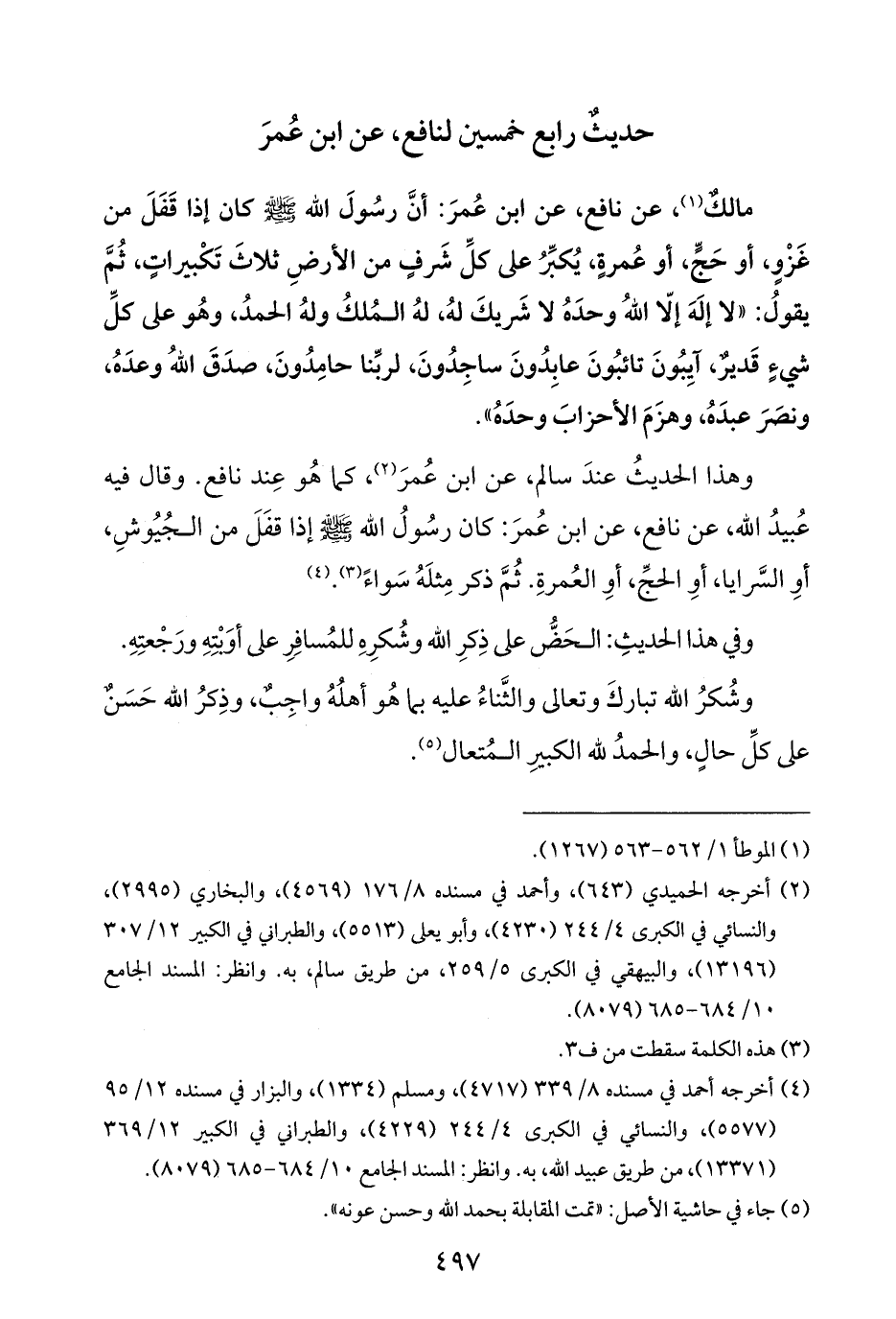 مالكٌ (¬١)، عن نافع، عن ابن عُمرَ: أنَّ رسُولَ الله -صلى الله عليه وسلم- كان إذا قَفَلَ من غَزْوٍ، أو حَجٍّ، أو عُمرةٍ، يُكبِّرُ على كلِّ شَرفٍ من الأرضِ ثلاثَ تَكْبيراتٍ، ثُمَّ يقولُ: "لا إلَهَ إلّا اللهُ وحدَهُ لا شَريكَ لهُ، لهُ المُلكُ ولهُ الحمدُ، وهُو على كلِّ شيءٍ قَديرٌ، آيِبُونَ تائبُونَ عابِدُونَ ساجِدُونَ، لربّنا حامِدُونَ، صدَقَ اللهُ وعدَهُ، ونصَرَ عبدَهُ، وهزَمَ الأحزابَ وحدَهُ".
