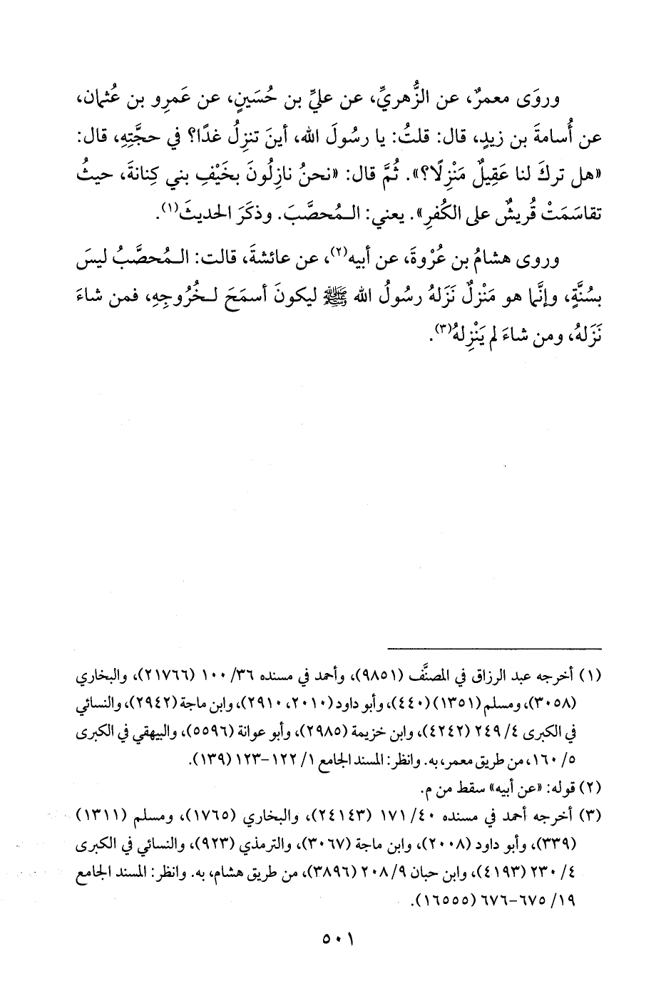 وروَى معمرٌ، عن الزُّهريِّ، عن عليِّ بن حُسَينٍ، عن عَمرِو بن عُثمان، عن أُسامةَ بن زيدٍ، قال: قلتُ: يا رسُولَ الله، أينَ تنزِلُ غدًا؟ في حجَّتِهِ، قال: "هل تركَ لنا عَقِيلٌ مَنْزِلًا؟ ". ثُمَّ قال: "نحنُ نازِلُونَ بخَيْفِ بني كِنانةَ، حيثُ تقاسَمَتْ قُريشٌ على الكُفرِ". يعني: المُحصَّبَ. وذكَرَ الحديثَ (¬١).