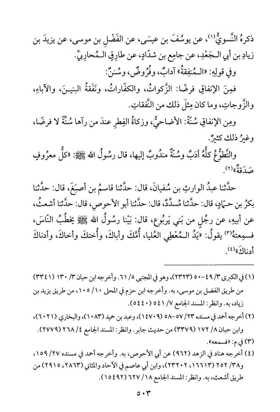 حدَّثنا عبدُ الوارثِ بن سُفيانَ، قال: حدَّثنا قاسمُ بن أصبَغَ، قال: حدَّثنا بكرُ بن حمّادٍ، قال: حدَّثنا مُسدَّدٌ، قال: حدَّثنا أبو الأحوصِ، قال: حدَّثنا أشعثُ، عن أبيهِ، عن رجُلٍ من بَني يَربُوع، قال: بَيْنا رسولُ الله -صلى الله عليه وسلم- يخطُبُ النّاسَ، فسمِعتهُ (¬٣) يقولُ: "يَدُ المُعْطِي العُليا، أُمَّكَ وأباكَ، وأُختكَ وأخاكَ، وأدناكَ أدناكَ" (¬٤).