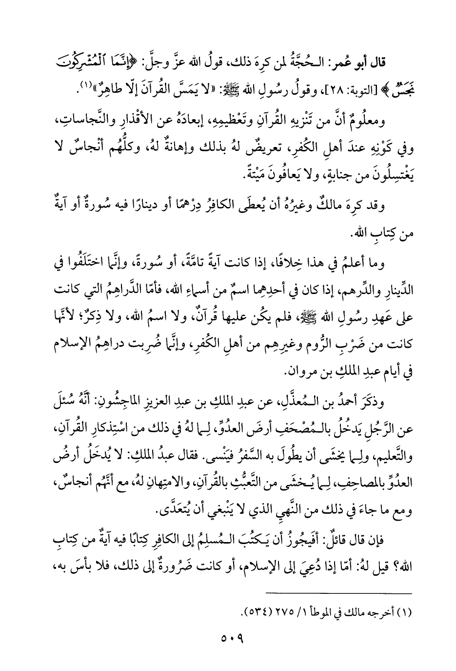 وقد كرِهَ مالكٌ وغيرُهُ أن يُعطَى الكافِرُ دِرْهمًا أو دينارًا فيه سُورةٌ أو آيةٌ من كِتابِ الله.