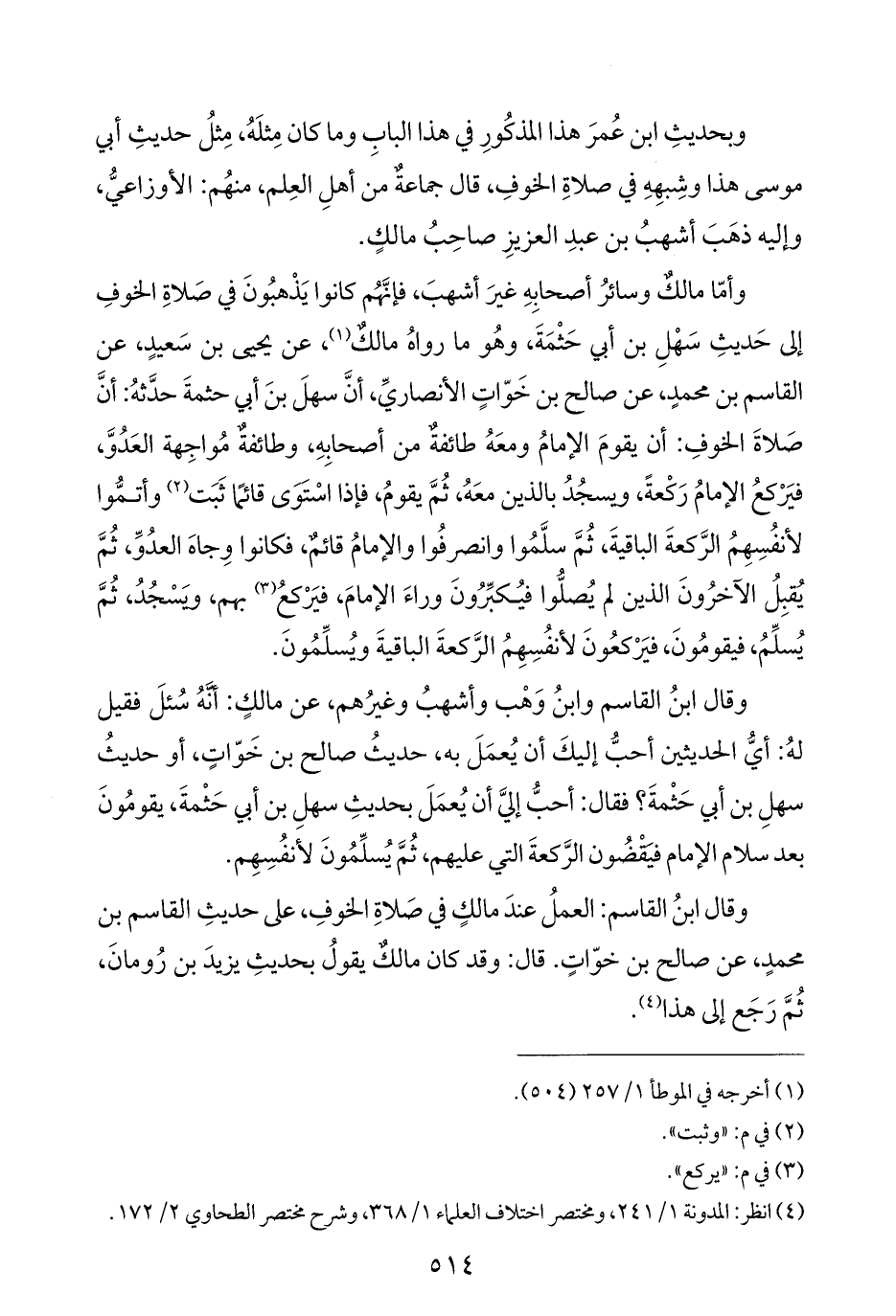 وقال ابنُ القاسم: العملُ عندَ مالكٍ في صَلاةِ الخوفِ، على حديثِ القاسم بن محمدٍ، عن صالح بن خوّاتٍ. قال: وقد كان مالكٌ يقولُ بحديثِ يزيدَ بن رُومانَ، ثُمَّ رَجَع إلى هذا (¬٤).