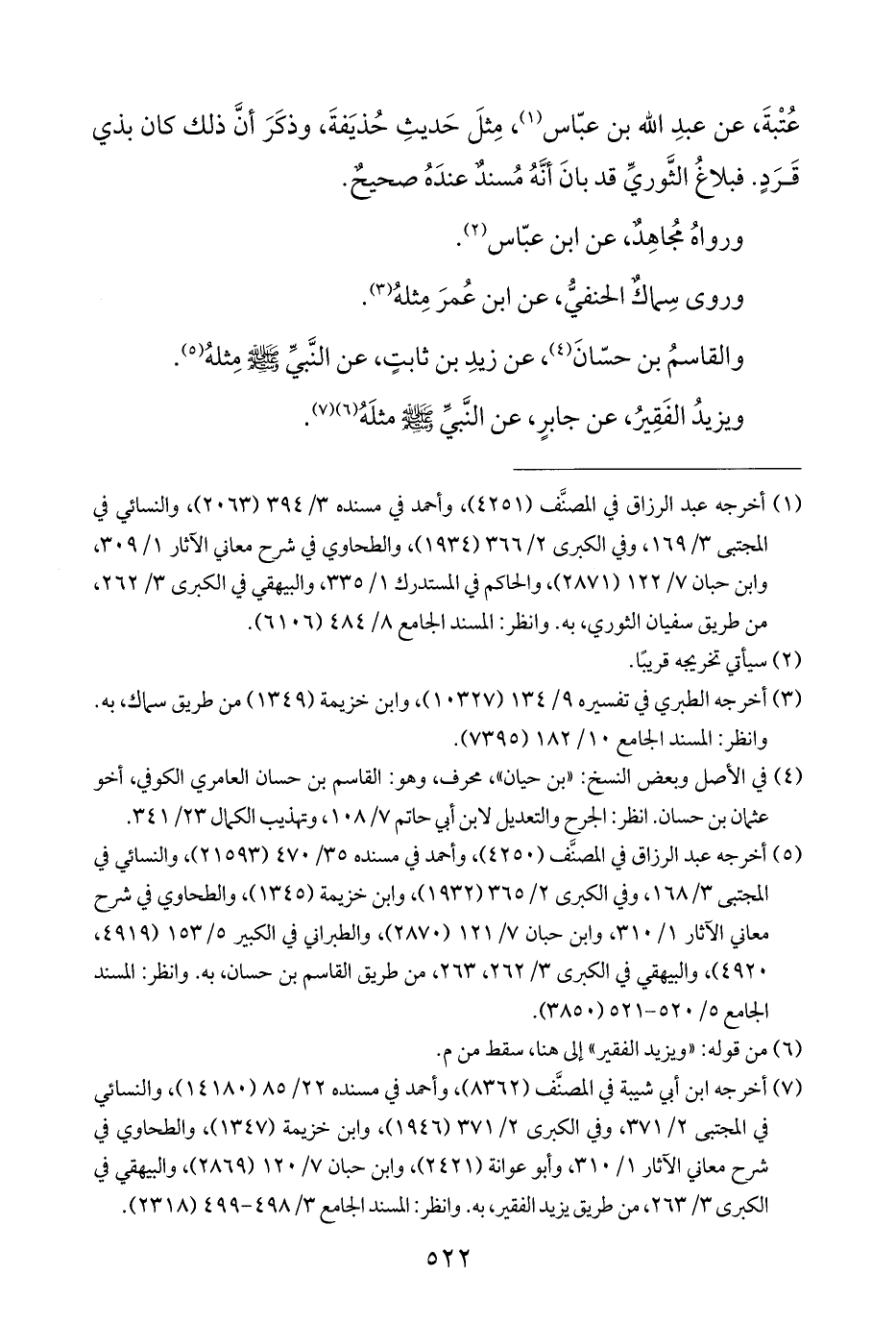 عُتْبةَ، عن عبدِ الله بن عبّاس (¬١)، مِثلَ حَديثِ حُذيَفةَ، وذكَرَ أنَّ ذلك كان بذي قَرَدٍ. فبلاغُ الثَّوريِّ قد بانَ أنَّهُ مُسندٌ عندَهُ صحيحٌ.