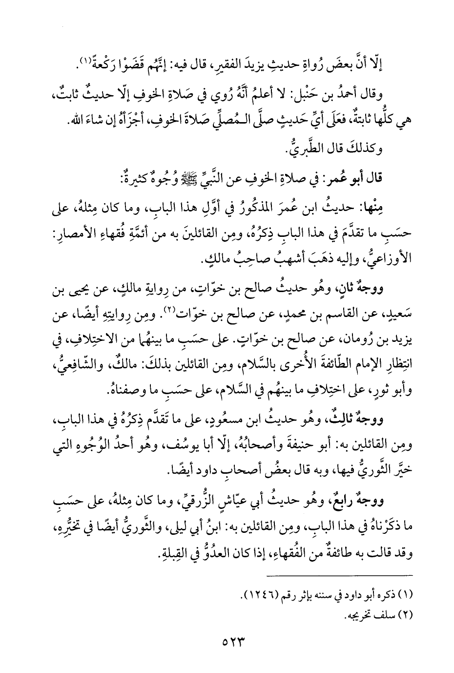 قال أبو عُمر: في صلاةِ الخوفِ عن النَّبيِّ -صلى الله عليه وسلم- وُجُوهٌ كثيرةٌ: