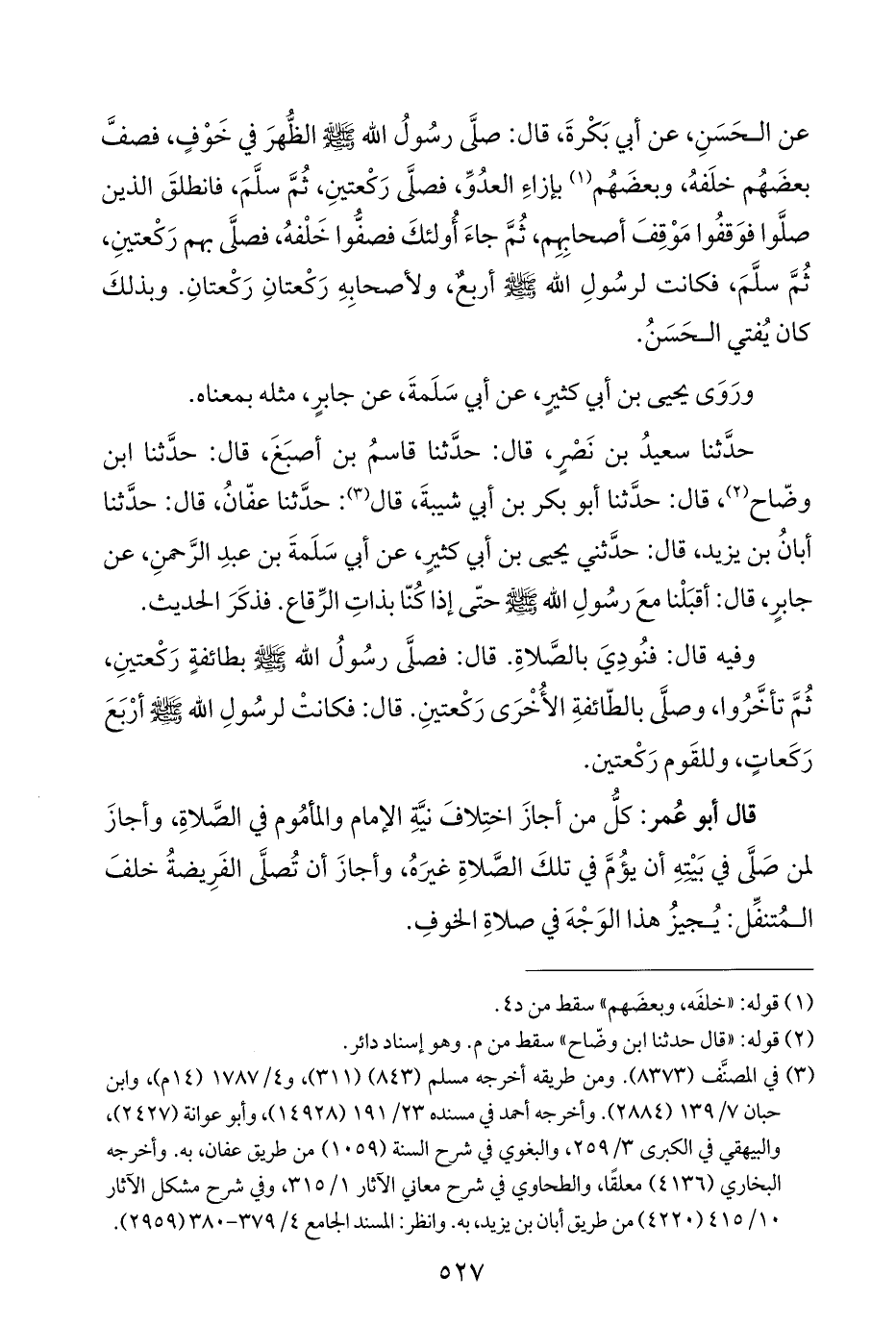 عن الحَسَنِ، عن أبي بَكْرةَ، قال: صلَّى رسُولُ الله -صلى الله عليه وسلم- الظُّهرَ في خَوْفٍ، فصفَّ بعضَهُم خلَفهُ، وبعضهُم (¬١) بإزاءِ العدُوِّ، فصلَّى رَكْعتينِ، ثُمَّ سلَّمَ، فانطلقَ الذين صلَّوا فوَقفُوا مَوْقِفَ أصحابِهِم، ثُمَّ جاءَ أُولئكَ فصفُّوا خَلْفهُ، فصلَّى بهم رَكْعتينِ، ثُمَّ سلَّمَ، فكانت لرسُولِ الله -صلى الله عليه وسلم- أربعٌ، ولأصحابِهِ رَكْعتانِ رَكْعتانِ. وبذلكَ كان يُفتي الحَسَنُ.