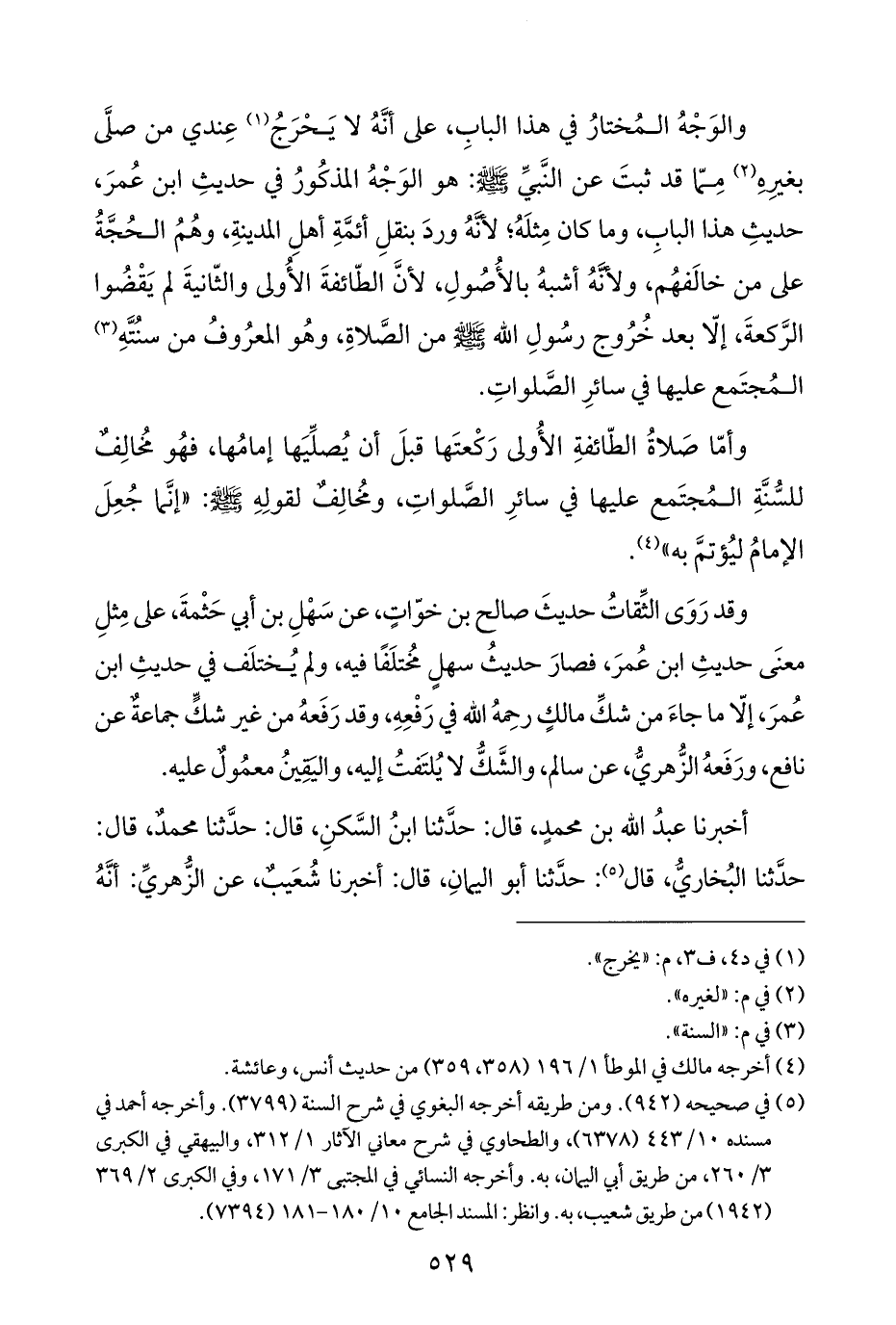 وأمّا صَلاةُ الطّائفةِ الأُولى رَكْعتَها قبلَ أن يُصلِّيَها إمامُها، فهُو مخُالِفٌ للسُّنَّةِ المُجتَمع عليها في سائرِ الصَّلواتِ، ومخُالِفٌ لقولِهِ -صلى الله عليه وسلم-: "إنَّما جُعِلَ الإمامُ ليُؤتمَّ به" (¬٤).