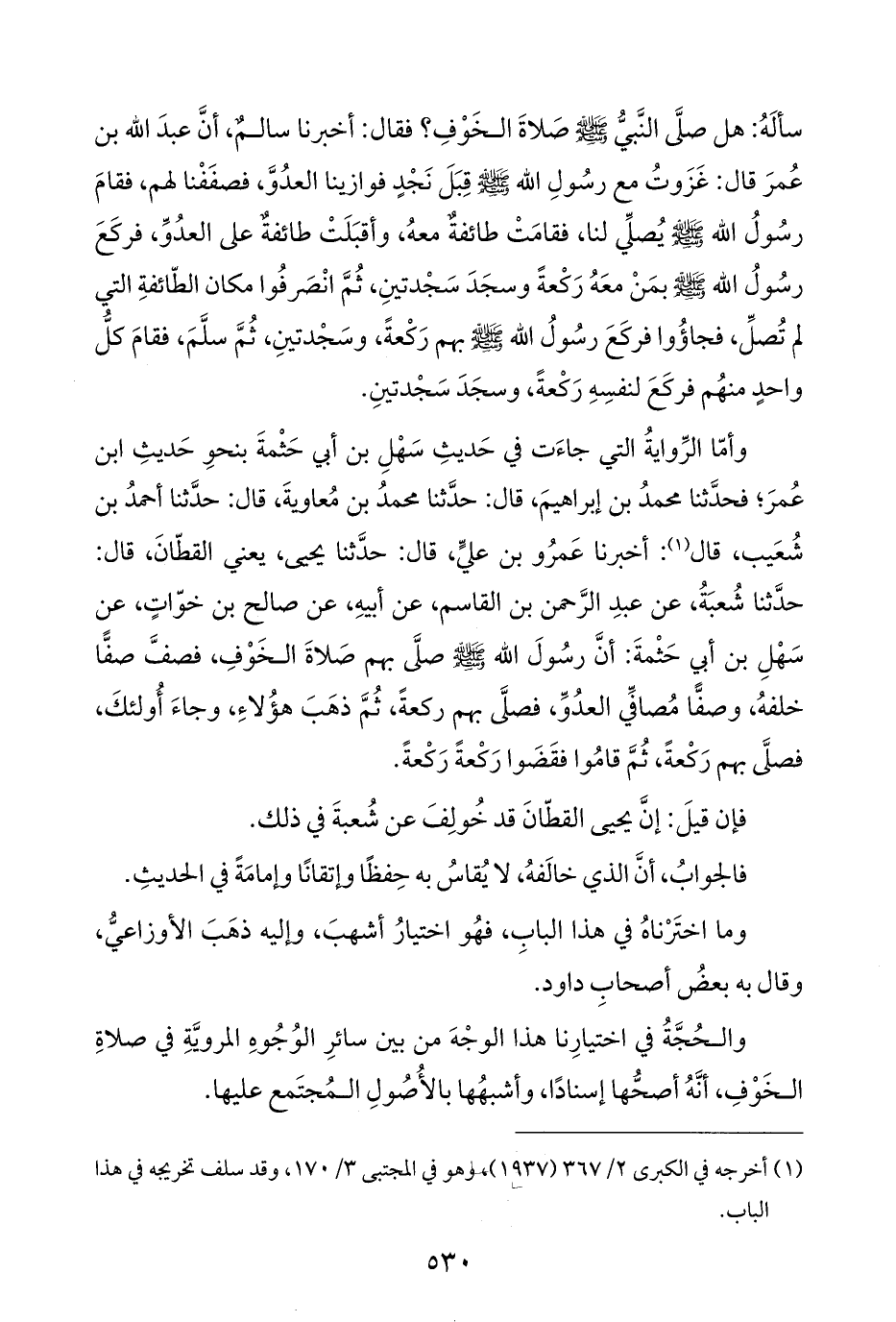 والحُجَّةُ في اختيارِنا هذا الوجْهَ من بين سائرِ الوُجُوهِ المرويَّةِ في صلاةِ الخَوْفِ، أنَّهُ أصحُّها إسنادًا، وأشبهُها بالأُصُولِ المُجتَمع عليها.