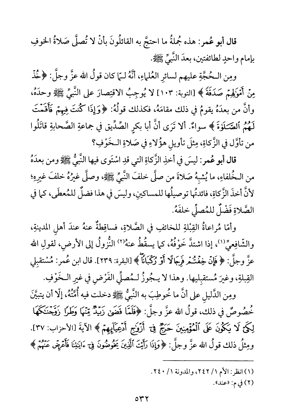ومِن الحُجَّةِ عليهم لسائرِ العُلماءِ، أنَّهُ لمّا كان قولُ الله عزَّ وجلَّ: {خُذْ مِنْ أَمْوَالِهِمْ صَدَقَةً} [التوبة: ١٠٣] لا يُوجِبُ الاقتِصارَ على النَّبيِّ -صلى الله عليه وسلم- وحدَهُ، وأنَّ من بعدَهُ يقومُ في ذلك مقامَهُ، فكذلك قولُهُ: {وَإِذَا كُنْتَ فِيهِمْ فَأَقَمْتَ لَهُمُ الصَّلَاةَ} سواءٌ. ألا ترَى أنَّ أبا بكرٍ الصدِّيق في جماعةِ الصَّحابةِ قاتَلُوا من تأوَّل في الزَّكاةِ، مِثلَ تأويلِ هؤُلاءِ في صَلاةِ الخَوْفِ؟