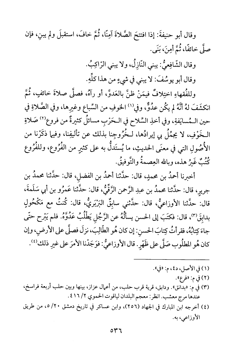 أخبرنا أحمدُ بن محمدٍ، قال: حدَّثنا أحمدُ بن الفضلِ، قال: حدَّثنا محمدُ بن جريرٍ، قال: حدَّثنا محمدُ بن عبدِ الرَّحمن الرَّقِّيُّ، قال: حدَّثنا عَمرُو بن أبي سَلَمةَ، قال: حدَّثنا الأوزاعيُّ، قال: حدَّثني سابِقٌ البَرْبَريُّ، قال: كُنتُ مع مَكْحُولٍ بدابِقَ (¬٣)، قال: فكتَبَ إلى الحسن يسألُهُ عن الرَّجُلِ يَطْلُبُ عَدُوَّهُ. فلم يَبْرح حتّى جاءَ كِتابُهُ، فقرأتُ كِتابَ الحسنِ: إن كان هُو الطّالِبَ، نزلَ فصلَّى على الأرضِ، وإن كان هُو المطلُوب صَلَّى على ظَهْرٍ. قال الأوزاعيُّ: فوَجَدْنا الأمرَ على غيرِ ذلك (¬٤).